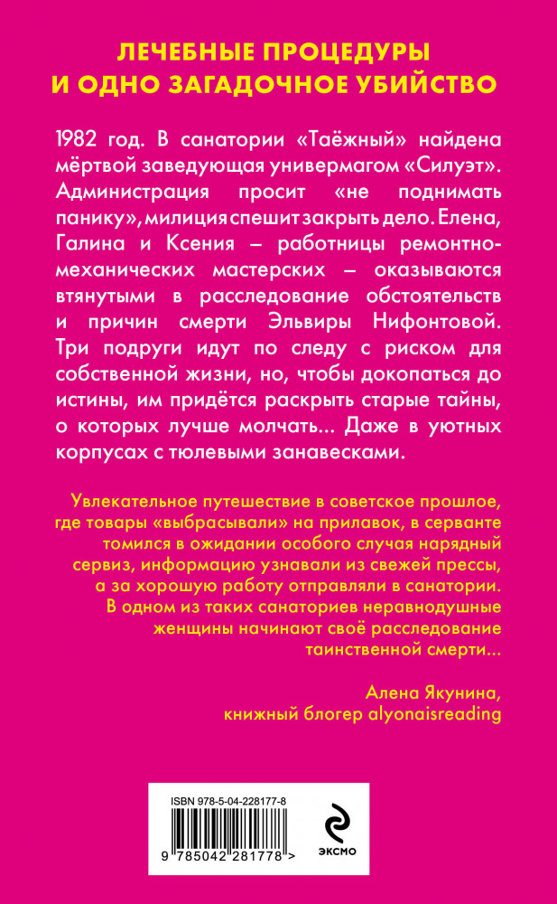 1982 год. В санатории «Таёжный» найдена мёртвой заведующая универмагом «Силуэт». Администрация просит «не поднимать панику», милиция спешит закрыть дело. Елена, Галина и Ксения — работницы ремонтно-механических мастерских — оказываются втянутыми в расследование обстоятельств и причин смерти Эльвиры Нифонтовой. Три подруги идут по следу с риском для собственной жизни, но чтобы докопаться до истины, им придётся раскрыть старые тайны, о которых лучше молчать... Даже в уютных корпусах с тюлевыми занавесками.