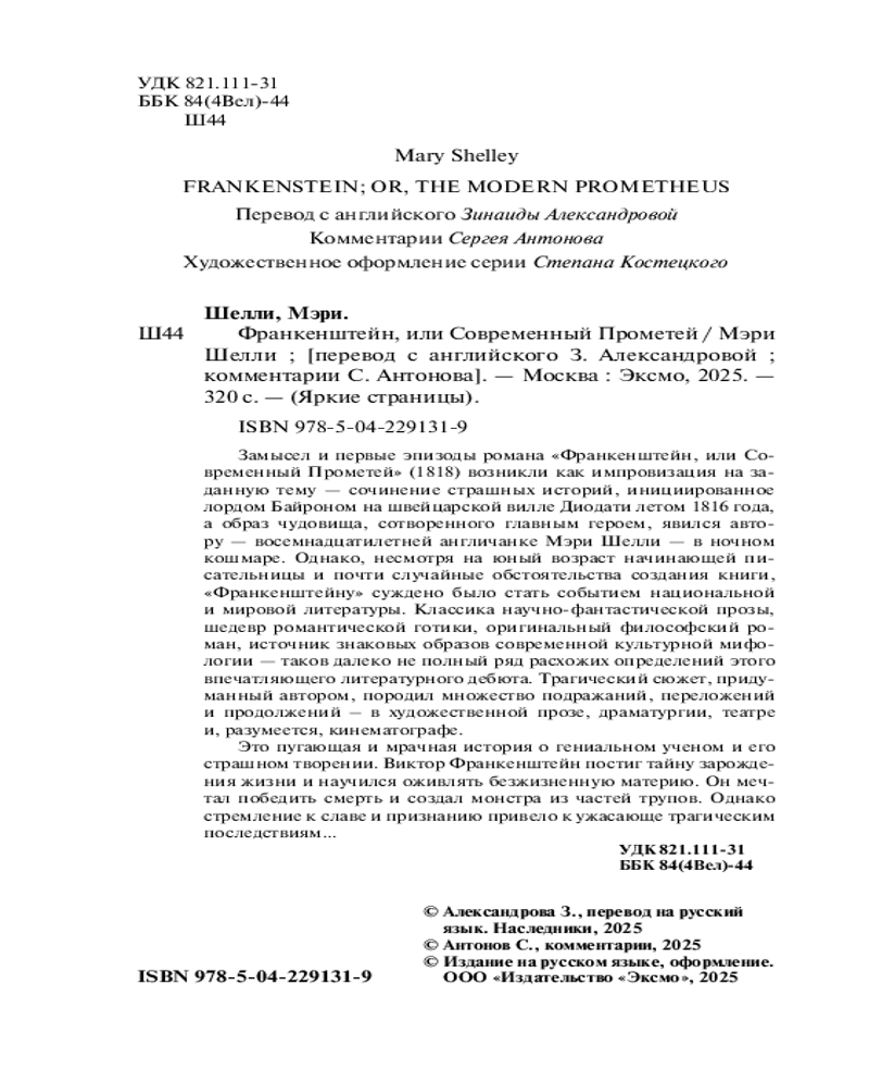 Настоящее издание подробно комментировано. В ноябре 2025 на экране выходит фильм Гильермо дель Торо «Франкенштейн», а в 2026 нас ждёт ещё одна премьера — фильм «Невеста» Мэгги Джилленхол, ремейк классического кинофильма «Невеста Франкенштейна» 1935 года. Оба фильма сняты по мотивам произведения Мэри Шелли. |
