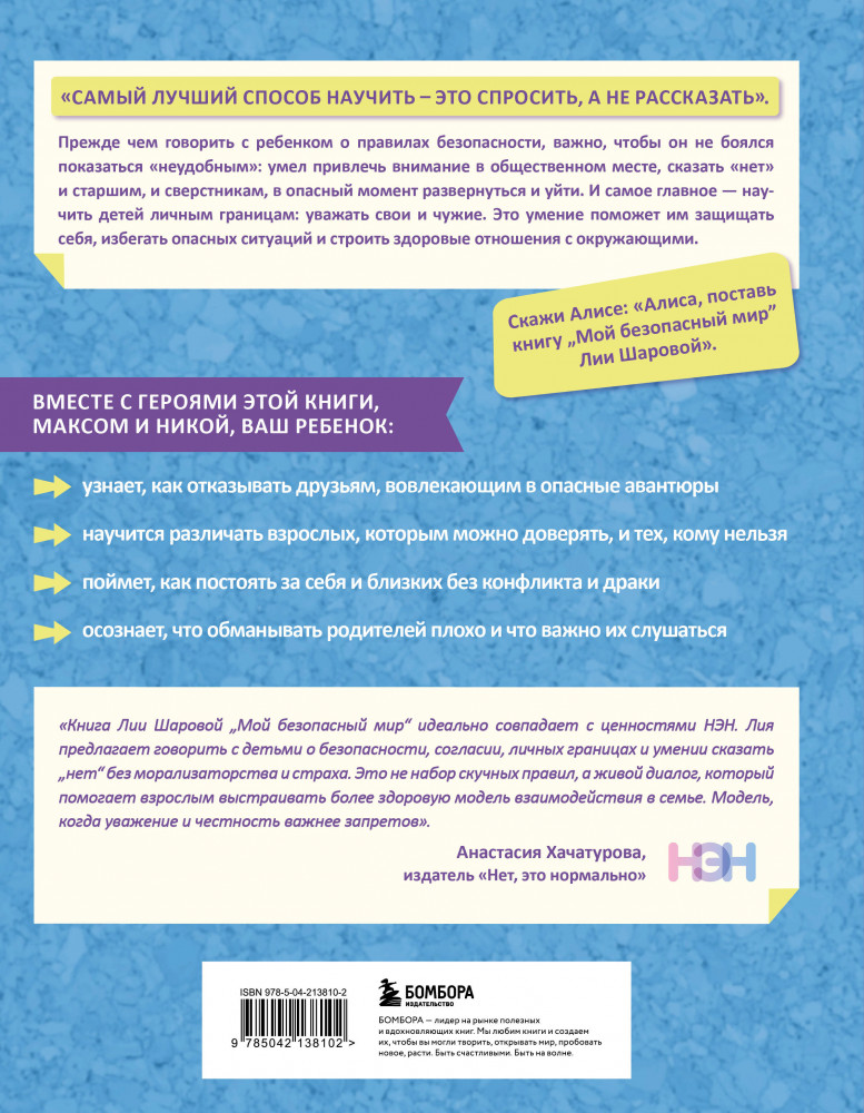 Серия: Безопасность и взросление детей. Книги психолога и педагога Лии Шаровой Нам важно научить детей безопасности. Но прежде чем объяснять, как разговаривать со взрослыми и что делать в экстренной ситуации, нужно, чтобы ребенок не боялся показаться «неудобным»: умел привлечь внимание в общественном месте, сказать «нет» и старшим, и сверстникам, в опасный момент — развернуться и уйти. Самое важное — научить детей личным границам: своим и чужим. Именно умение их отстаивать поможет не вестись на провокации сверстников, уметь отказывать незнакомцам, уважать себя и близких, а также правильно ссориться и мириться с друзьями. |