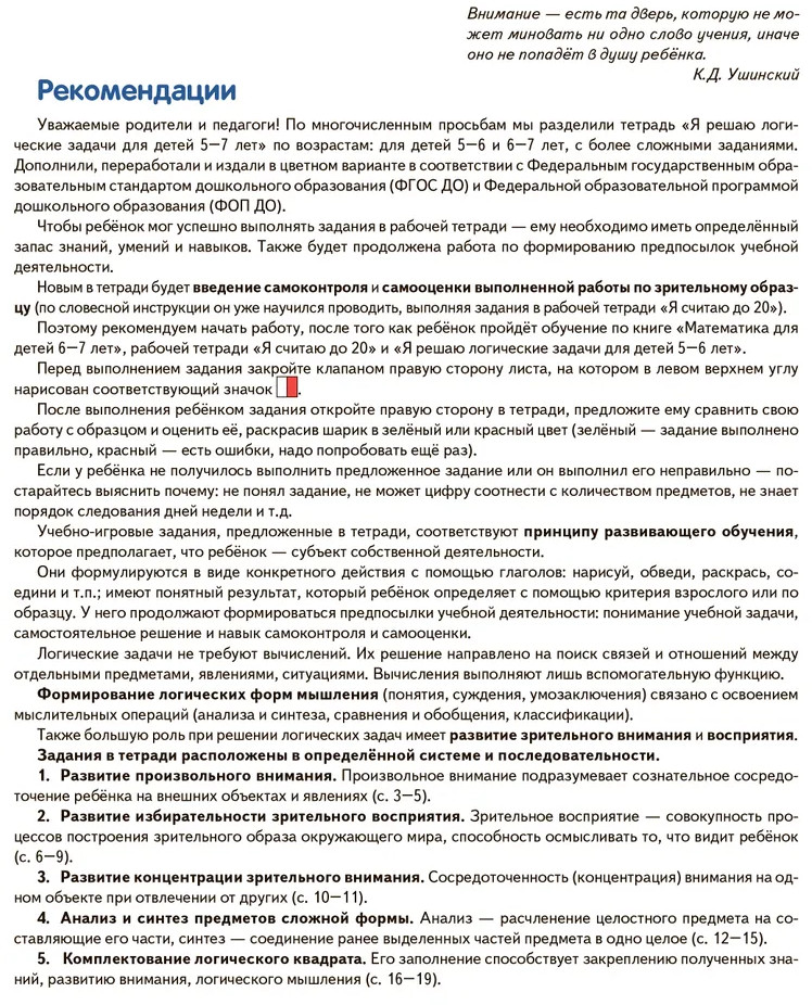 Серия: Математические ступеньки Погрузитесь в увлекательный мир логики и мышления с тетрадью «Я решаю логические задачи»! Это уникальное издание создано для того, чтобы развивать у детей 6–7 лет важнейшие навыки, необходимые для успешного обучения и жизни. В тетради собраны разнообразные задания, которые не только увлекут вашего ребенка, но и помогут ему стать более внимательным, самостоятельным и любознательным. Тетрадь включает в себя задания на развитие произвольного внимания, концентрации, анализа и синтеза предметов сложной формы, а также словесно-логические игры. Каждый раздел предлагает новые вызовы и возможности для обучения. Выполнение заданий побуждает ребенка к активному мышлению, что способствует развитию его аналитических способностей и логического мышления. В конце книги предусмотрен специальный клапан, который позволяет ребенку самостоятельно оценить свою работу по зрительному образцу. Это важный шаг к формированию навыков саморегуляции и ответственности. Издание входит в дополнительный комплект организационно-методического сопровождения технологии «Математические ступеньки», что делает его идеальным инструментом для совместной работы взрослого с ребенком. Задания способствуют формированию умений сравнивать, обобщать, анализировать и делать простейшие умозаключения, что является основой для успешного обучения в школе. Тетрадь рекомендована широкому кругу специалистов, работающих в дошкольных образовательных организациях, и может быть использована родителями при подготовке к школе. Увлекательные задания и игры помогут ребенку не только учиться, но и получать удовольствие от процесса, развивая его интерес к обучению. |
