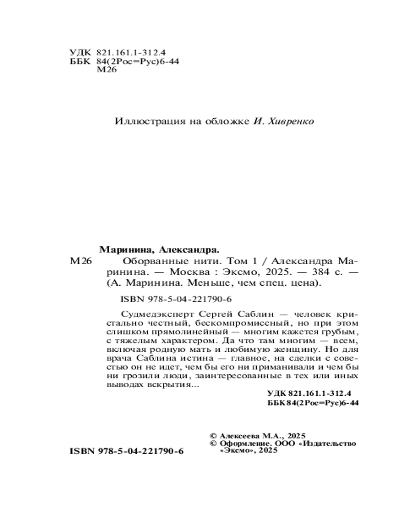 Серия: А.Маринина. Меньше, чем спец.цена (обложка) Судмедэксперт Сергей Саблин — человек кристально честный, бескомпромиссный, но при этом слишком прямолинейный — многим кажется грубым, с тяжелым характером. Да что там многим — всем, включая родную мать и любимую женщину. Но для врача Саблина истина — главное, на сделки с совестью он не идет, чем бы его ни приманивали и чем бы ни грозили люди, заинтересованные в тех или иных выводах вскрытия... |