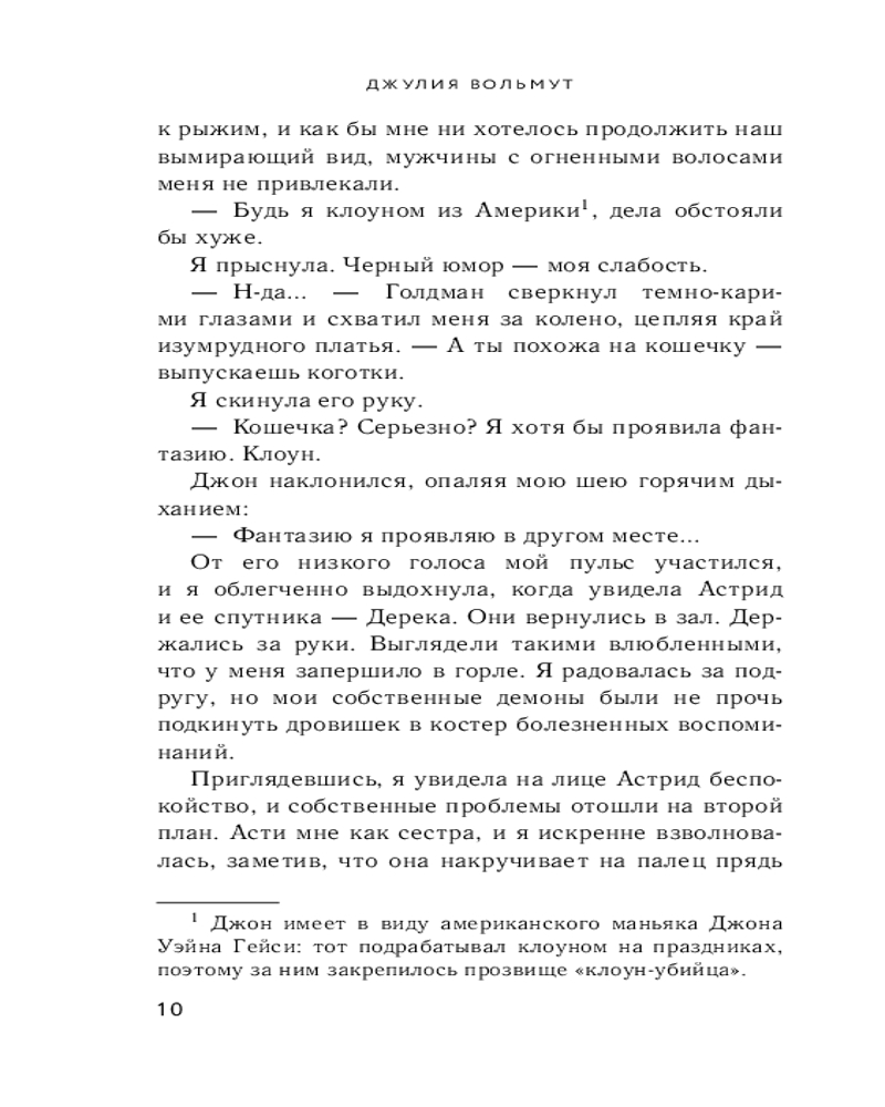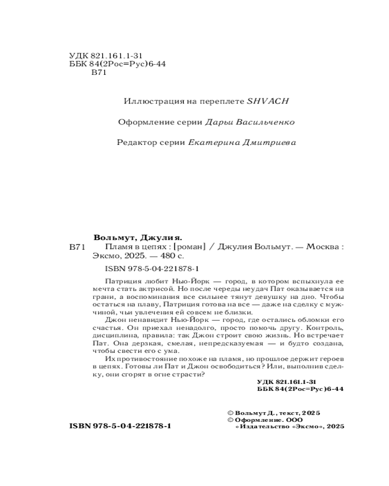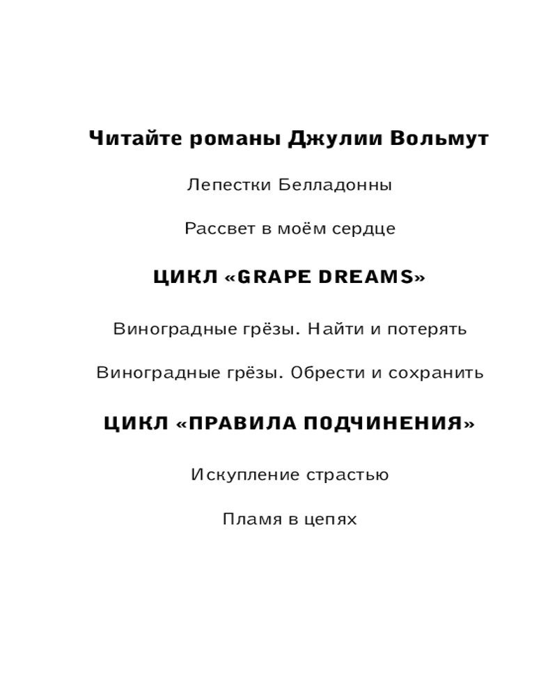 Серия: Dark Romance. Обжигающая любовь. Романы Джулии Вольмут Патриция любит Нью-Йорк — город, в котором вспыхнула ее мечта стать актрисой. Но после череды неудач Пат оказывается на грани, а воспоминания всё сильнее тянут девушку на дно. Чтобы остаться на плаву, Патриция готова на всё — даже на сделку с мужчиной, чьи увлечения ей совсем не близки. |