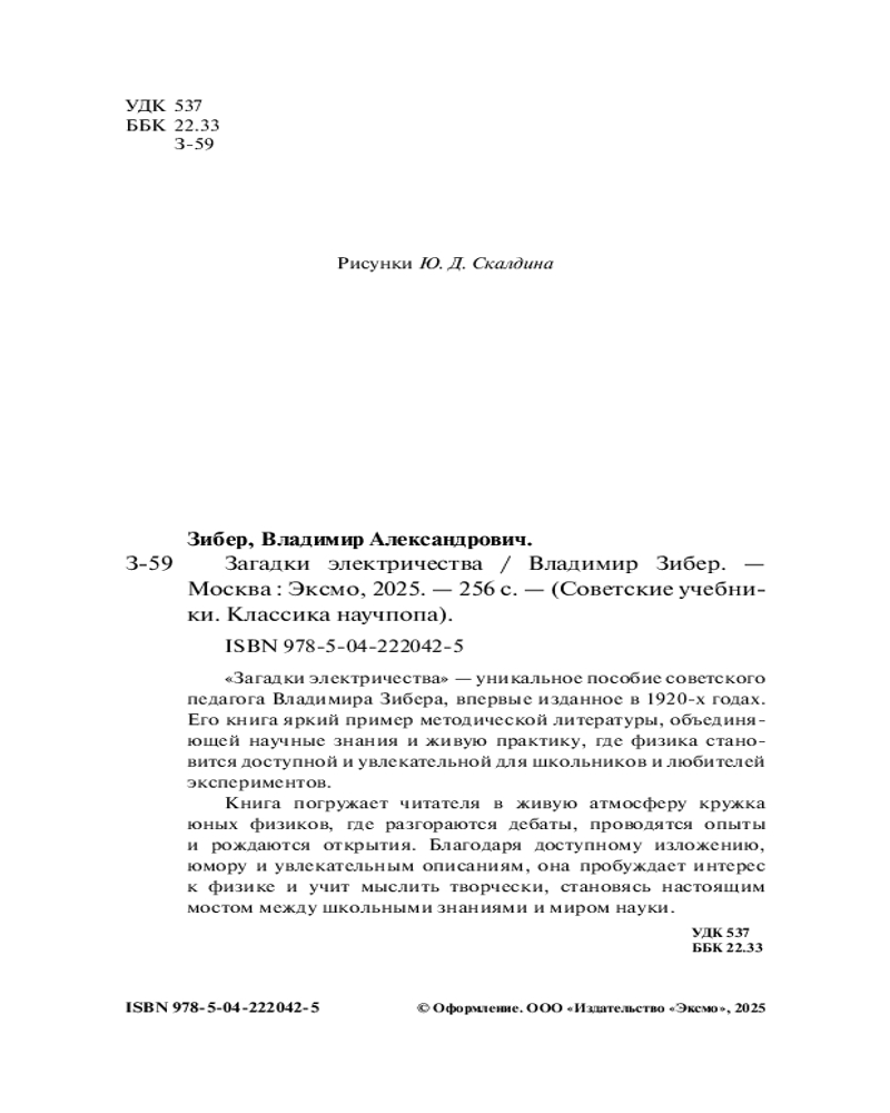 Серия: Советские учебники. Классика научпопа Хотите узнать тайны электричества и почувствовать себя настоящим исследователем? «Загадки электричества» — это книга, которая превращает физику в приключение, а простые эксперименты — в ключ к сложным открытиям. Владимир Зибер, талантливый педагог и популяризатор науки, показывает, что понять электричество может каждый, если взять в руки свечу, кусок бумаги или даже гвоздь. |