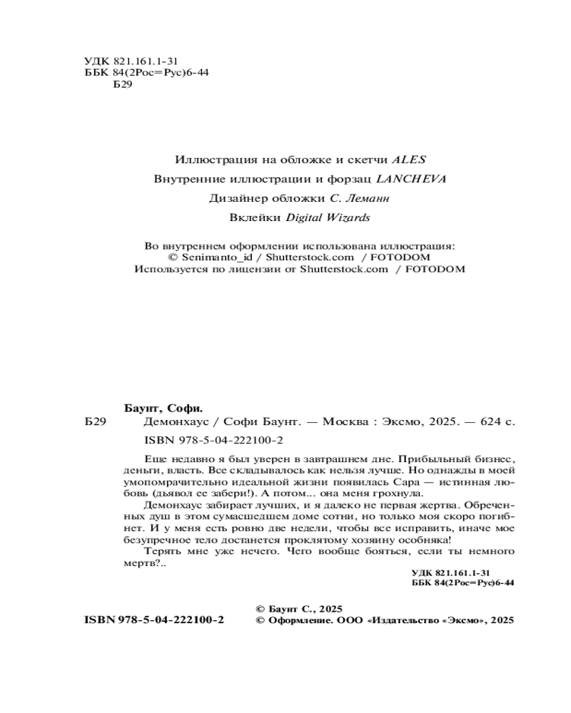 Серия: Право на любовь. Остросюжетные романы Софи Баунт Еще недавно я был уверен в завтрашнем дне. Прибыльный бизнес, деньги, власть. Всё складывалось как нельзя лучше. Но однажды в моей умопомрачительно идеальной жизни появилась Сара — истинная любовь (дьявол ее забери!). А потом... Она меня грохнула. Демонхаус забирает лучших, и я далеко не первая жертва. Обреченных душ в этом сумасшедшем доме сотни, но только моя скоро погибнет. И у меня есть ровно две недели, чтобы всё исправить, иначе мое безупречное тело достанется проклятому хозяину особняка! Терять мне уже нечего. Чего вообще бояться, если ты немного мёртв?.. |