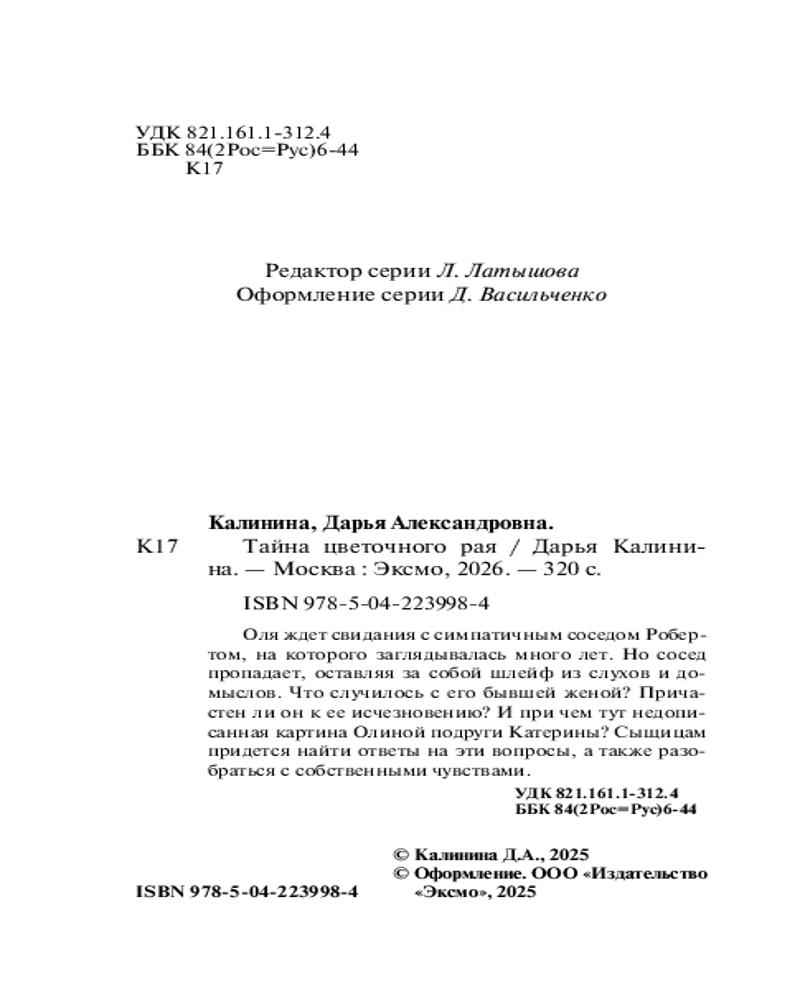 Серия: Детективы для хорошего настроения Дарьи Калининой (обложка) Оля ждет свидания с симпатичным соседом Робертом, на которого заглядывалась много лет. Но сосед пропадает, оставляя за собой шлейф из слухов и домыслов. А пока Оля пытается выяснить, где правда, а где ложь, в поселке начинают пропадать женщины. Причастен ли Роберт к исчезновению своей бывшей жены и соседок? Кому еще грозит опасность? И при чем тут таинственный «Приют Марии Магдалены», в котором за закрытыми дверями происходит что-то неладное? Все ниточки, переплетаясь, ведут в прошлое... |