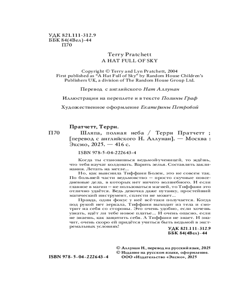 Серия: Магия Терри Пратчетта в иллюстрациях Полины Граф Когда ты становишься ведьмой-ученицей, то ждёшь, что тебя научат колдовать. Варить зелья. Составлять заклинания. Летать на метле... Но, как выяснила Тиффани Болен, это не совсем так. По большей части ведьмовство — просто скучные повседневные дела, в которых нет ничего волшебного. И если главное в магии — не пользоваться магией, то Тиффани это отлично удаётся. Ведь девочка даже путанку, простейший магический инструмент, сплести не может... |