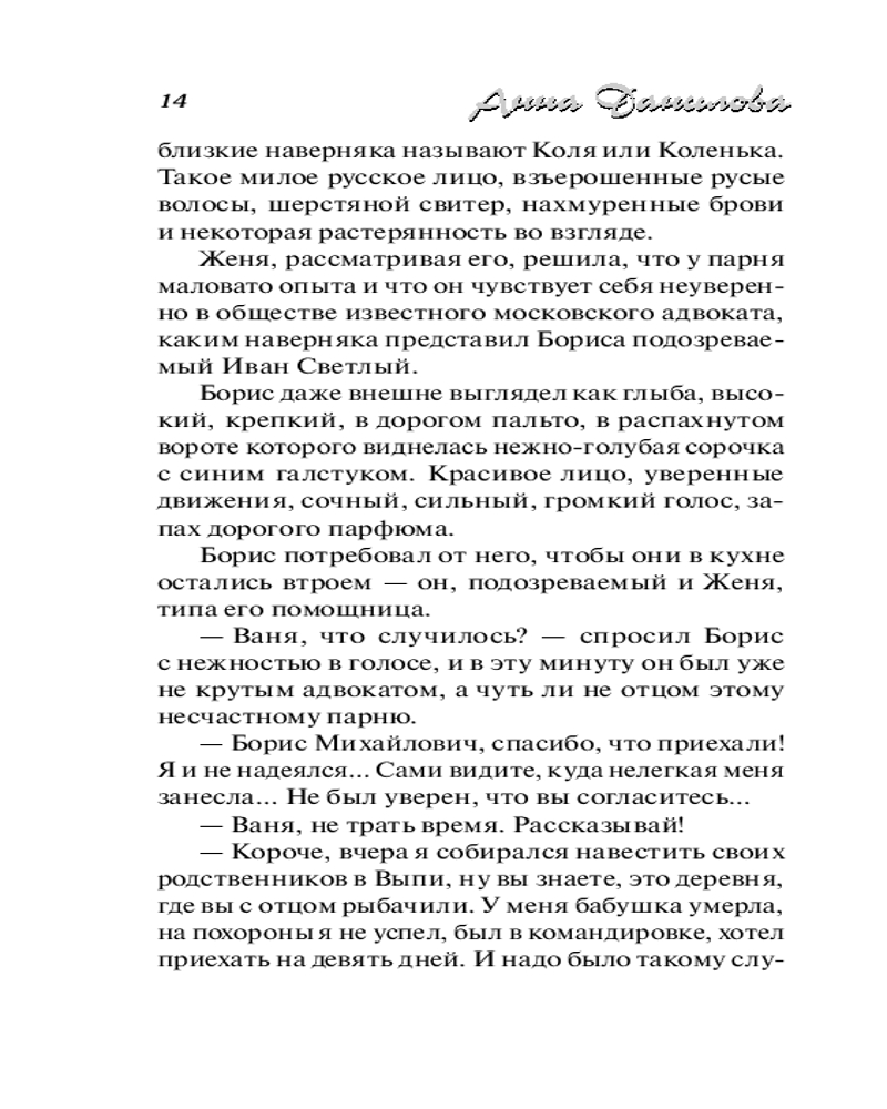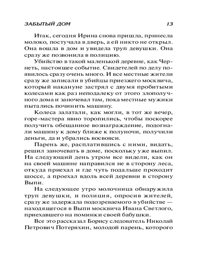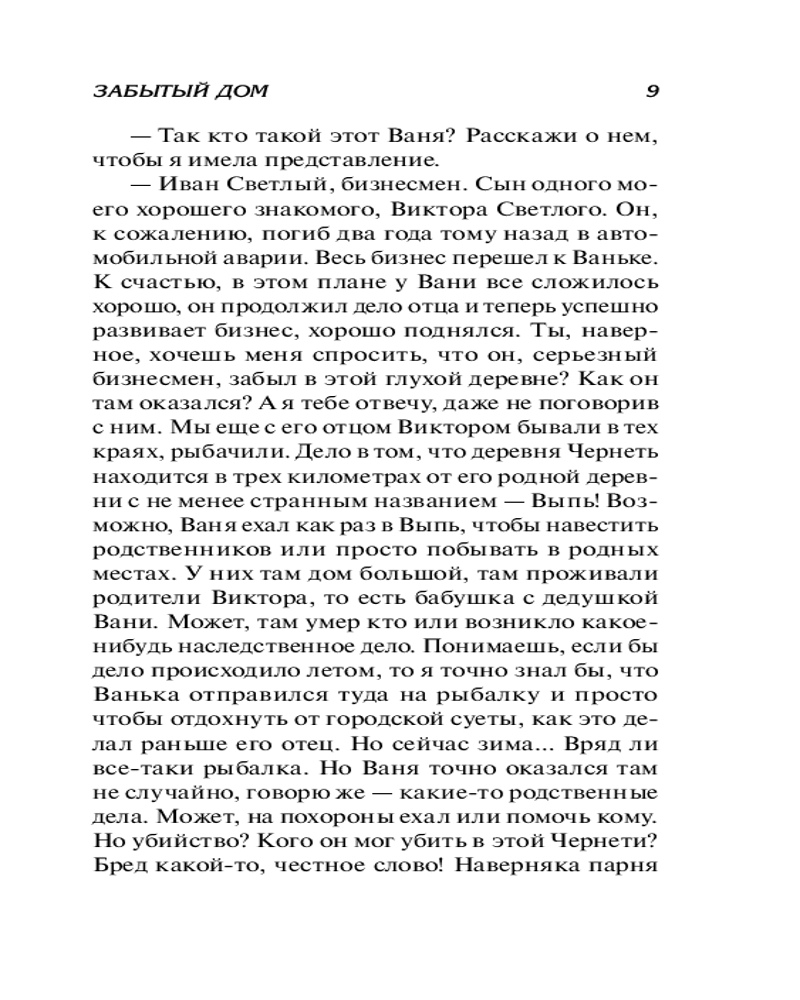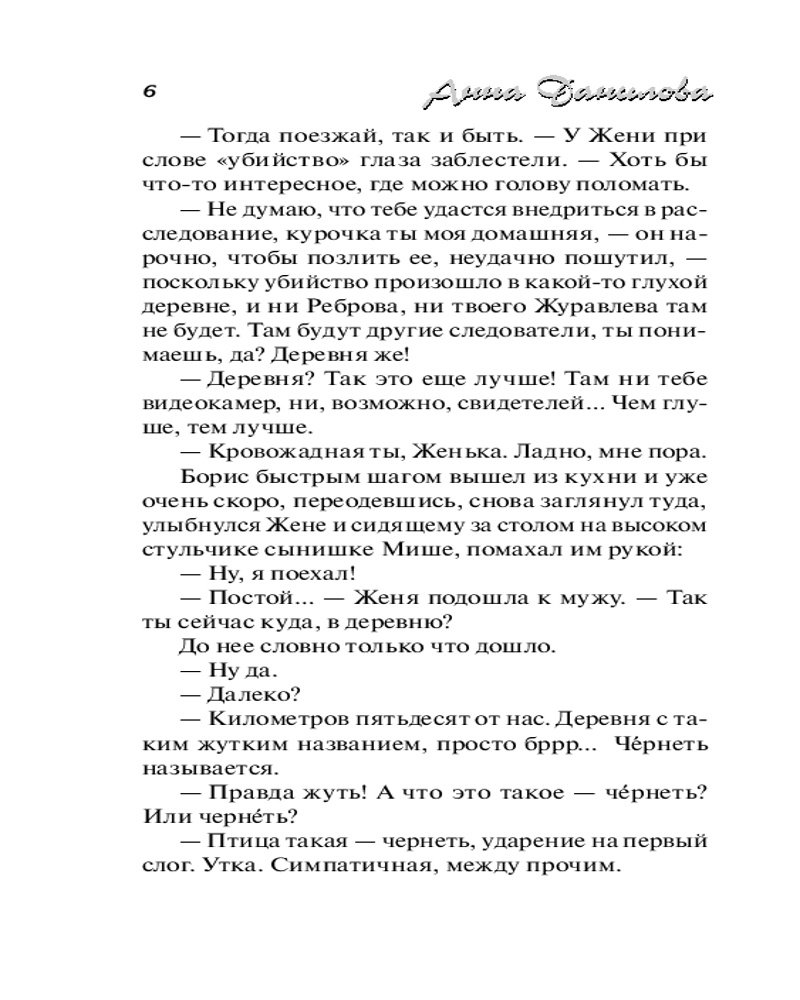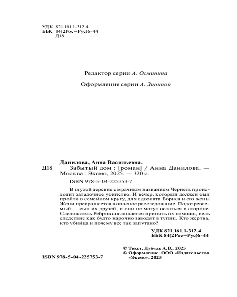Серия: Эффект мотылька. Детективы Анны Даниловой. Новые расследования В глухой деревне с мрачным названием Чернеть происходит загадочное убийство. И вечер, который должен был пройти в семейном кругу, для адвоката Бориса и его жены Жени превращается в опасное расследование. Подозреваемый — сын их друзей, и они не могут остаться в стороне. Следователь Ребров соглашается принять их помощь, ведь следствие как будто нарочно заводят в тупик. Кто жертва, кто убийца, и почему всё так запутано? |