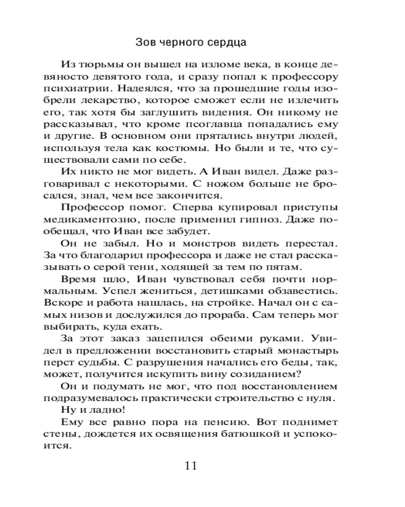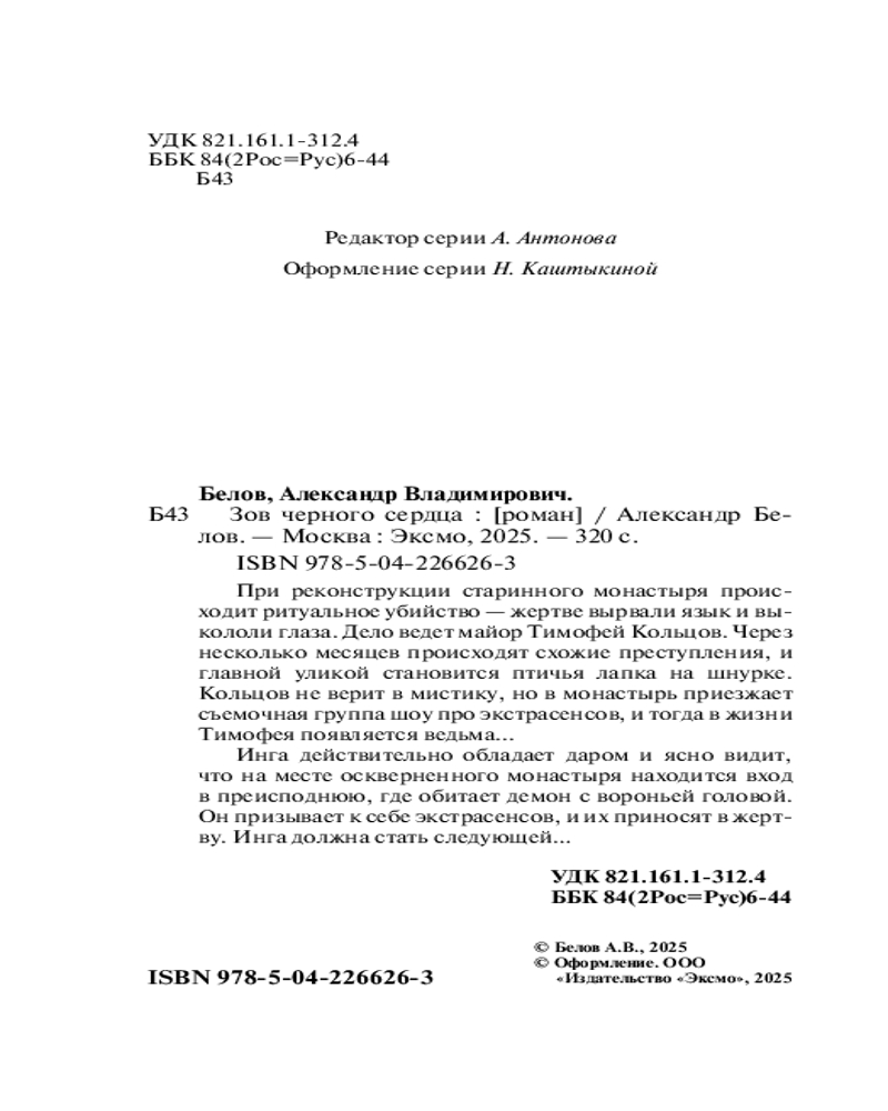 Серия: За гранью реальности. Мистические триллеры При реконструкции старинного монастыря происходит ритуальное убийство — жертве вырвали язык и выкололи глаза. Дело ведет майор Тимофей Кольцов. Через несколько месяцев происходят схожие преступления, и главной уликой становится птичья лапка на шнурке. Кольцов не верит в мистику, но в монастырь приезжает съемочная группа шоу про экстрасенсов, и тогда в жизни Тимофея появляется ведьма... |