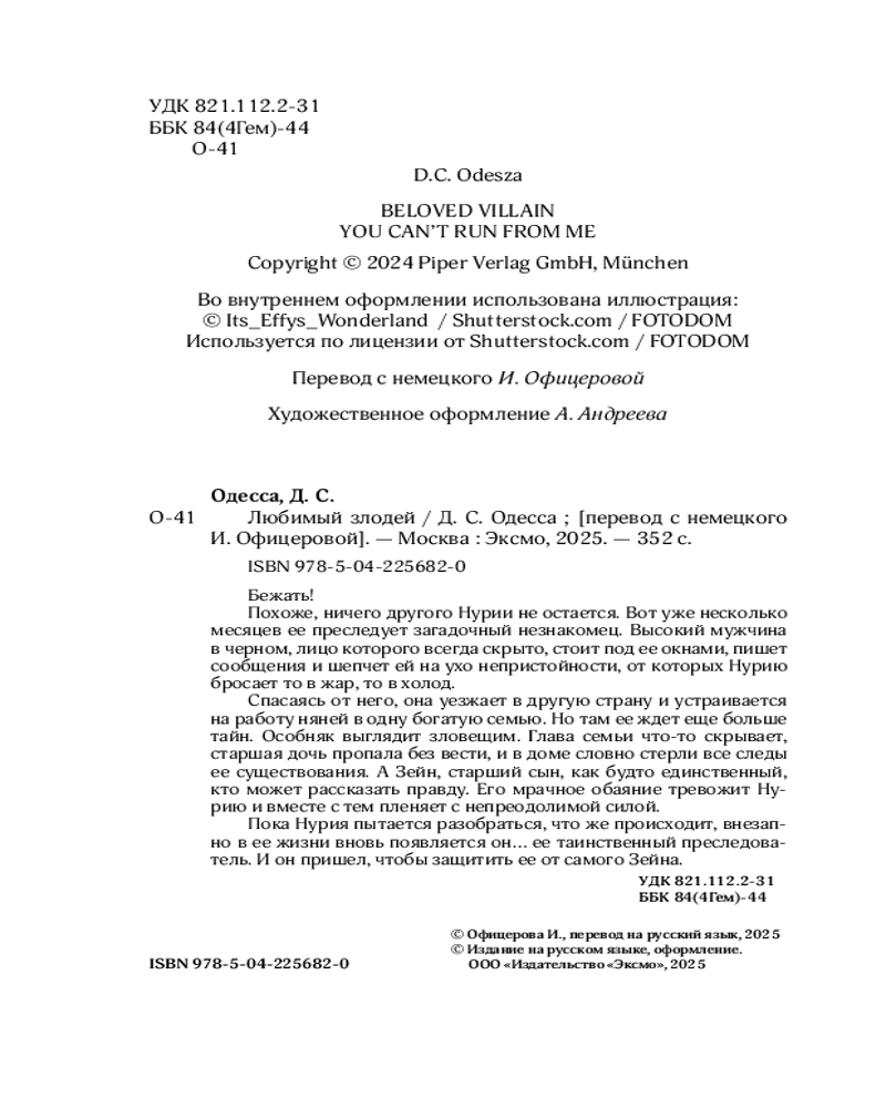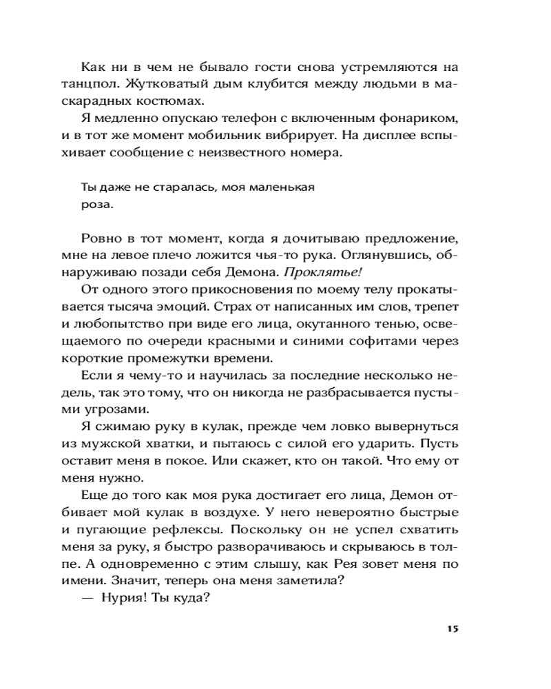 Серия: New Adult. Возлюбленный злодей Бежать! Похоже, ничего другого Нурии не остается. Вот уже несколько месяцев ее преследует загадочный незнакомец. Высокий мужчина в черном, лицо которого всегда скрыто, стоит под ее окнами, пишет сообщения и шепчет ей на ухо непристойности, от которых Нурию бросает то в жар, то в холод. Спасаясь от него, она уезжает в другую страну и устраивается на работу няней в одну богатую семью. Но там ее ждет еще больше тайн. Особняк выглядит зловещим. Глава семьи что-то скрывает, старшая дочь пропала без вести, и в доме словно стерли все следы ее существования. А Зейн, старший сын, как будто единственный, кто может рассказать правду. Его мрачное обаяние тревожит Нурию и вместе с тем пленяет с непреодолимой силой. Пока Нурия пытается разобраться, что же происходит, внезапно в ее жизни вновь появляется он... Ее таинственный преследователь. И он пришел, чтобы защитить ее от самого Зейна. |