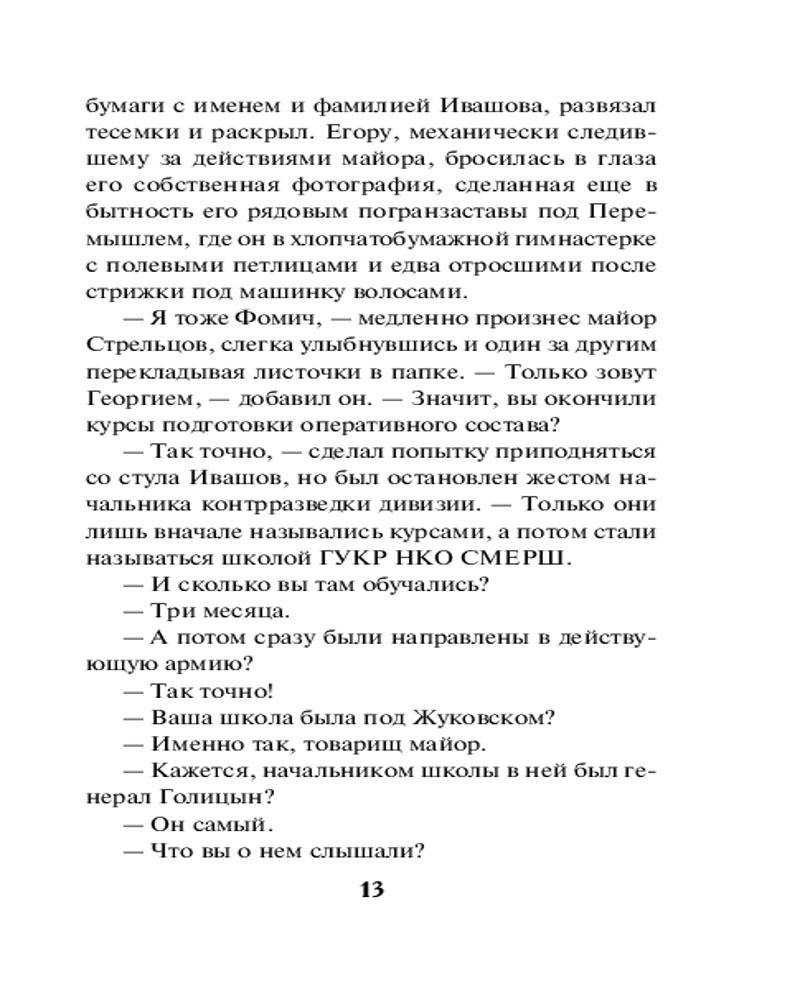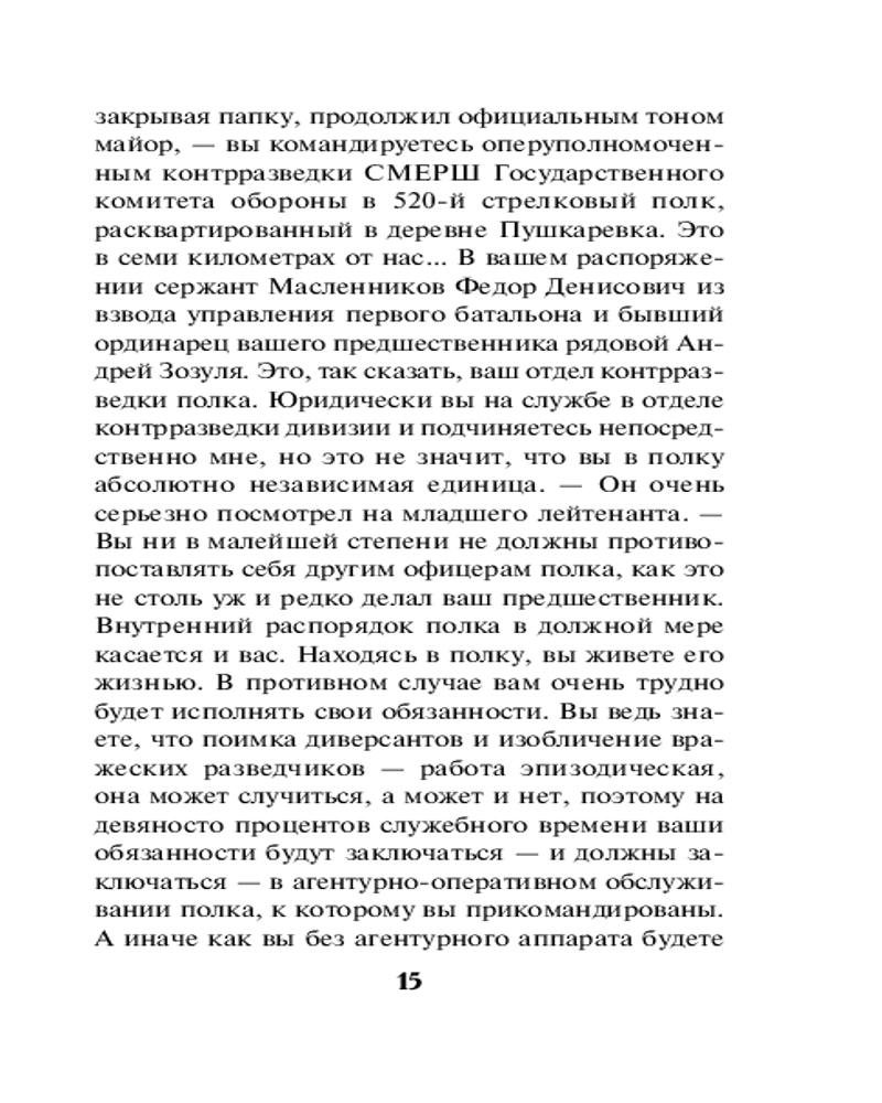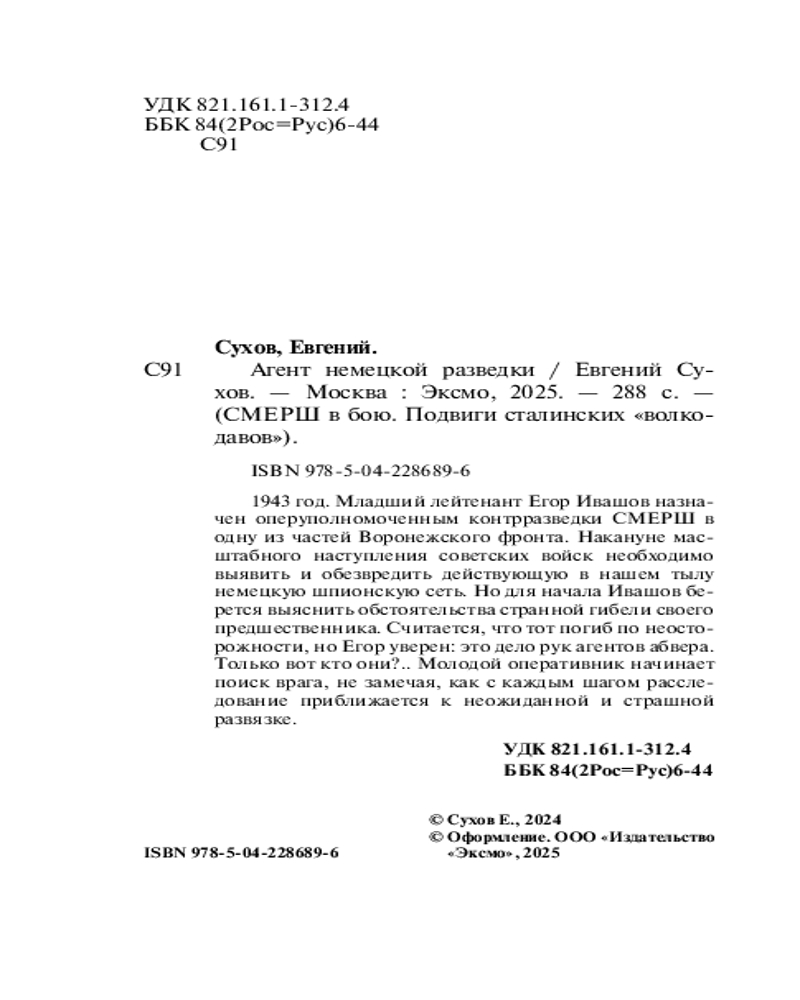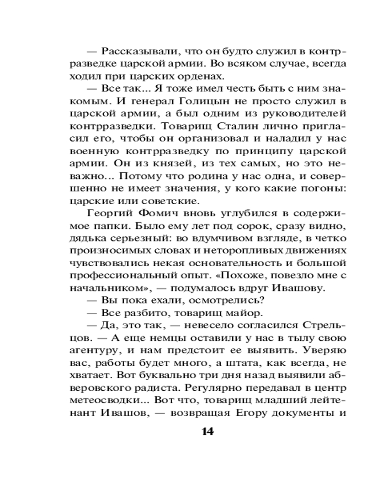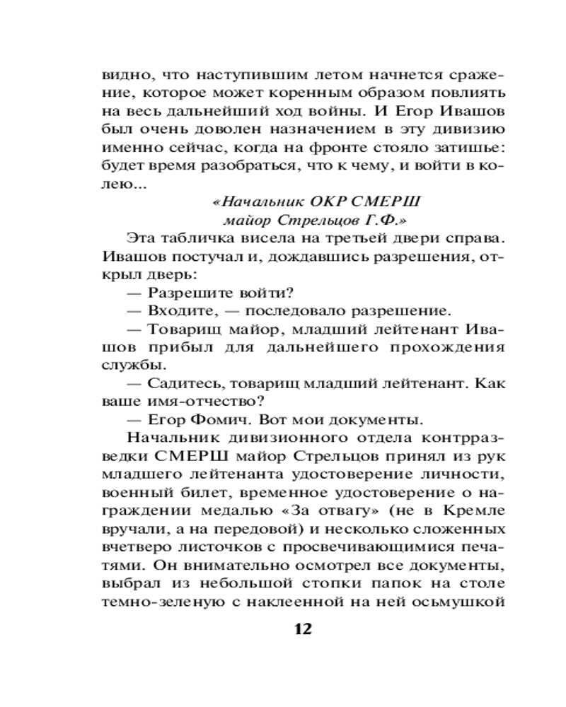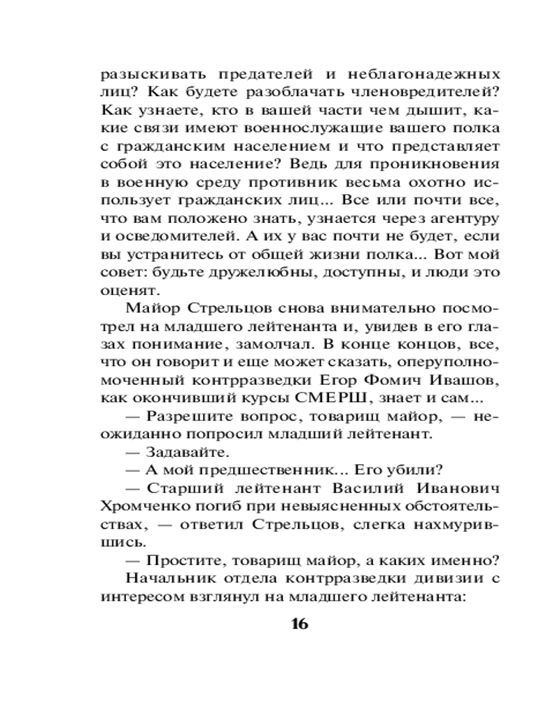 Серия: СМЕРШ в бою. Подвиги сталинских «волкодавов» 1943 год. Младший лейтенант Егор Ивашов назначен оперуполномоченным контрразведки СМЕРШа в одну из частей Воронежского фронта. Накануне масштабного наступления советских войск необходимо выявить и обезвредить действующую в нашем тылу немецкую шпионскую сеть. Но для начала Ивашов берется выяснить обстоятельства странной гибели своего предшественника. Считается, что тот погиб по неосторожности, но Егор уверен: это дело рук агентов Абвера. Только вот кто они?.. Молодой оперативник начинает поиск врага, не замечая, как с каждым шагом расследование приближается к неожиданной и страшной развязке. |