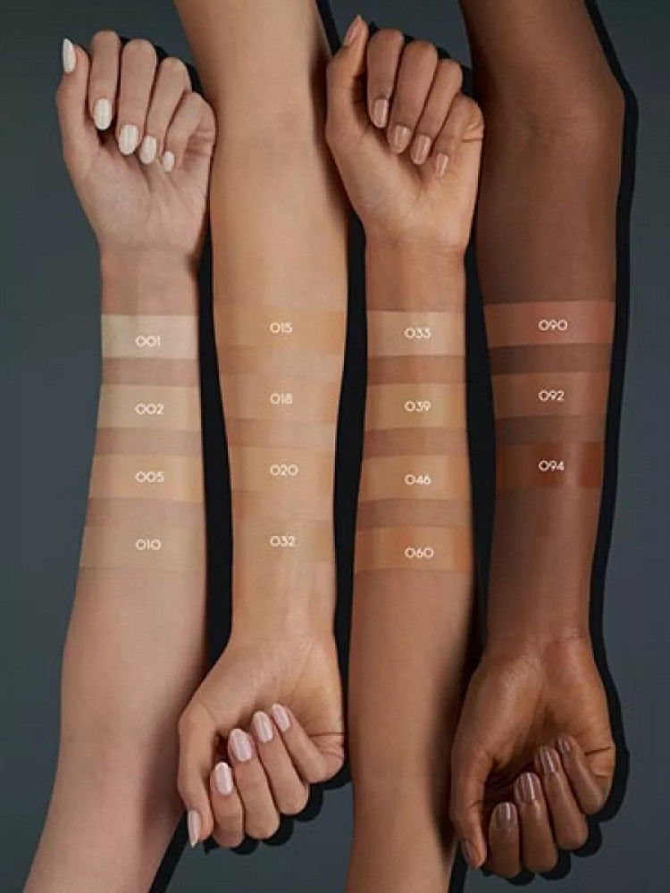 Довольно плотный, но хорошо тушуется и неплохо держится, может чуть скатываться в мимических морщинках, но это нормально и легко поправляется пальцем.