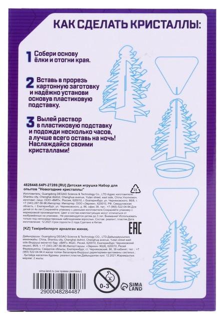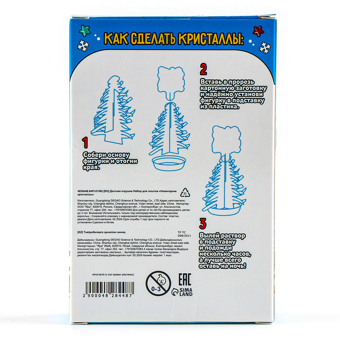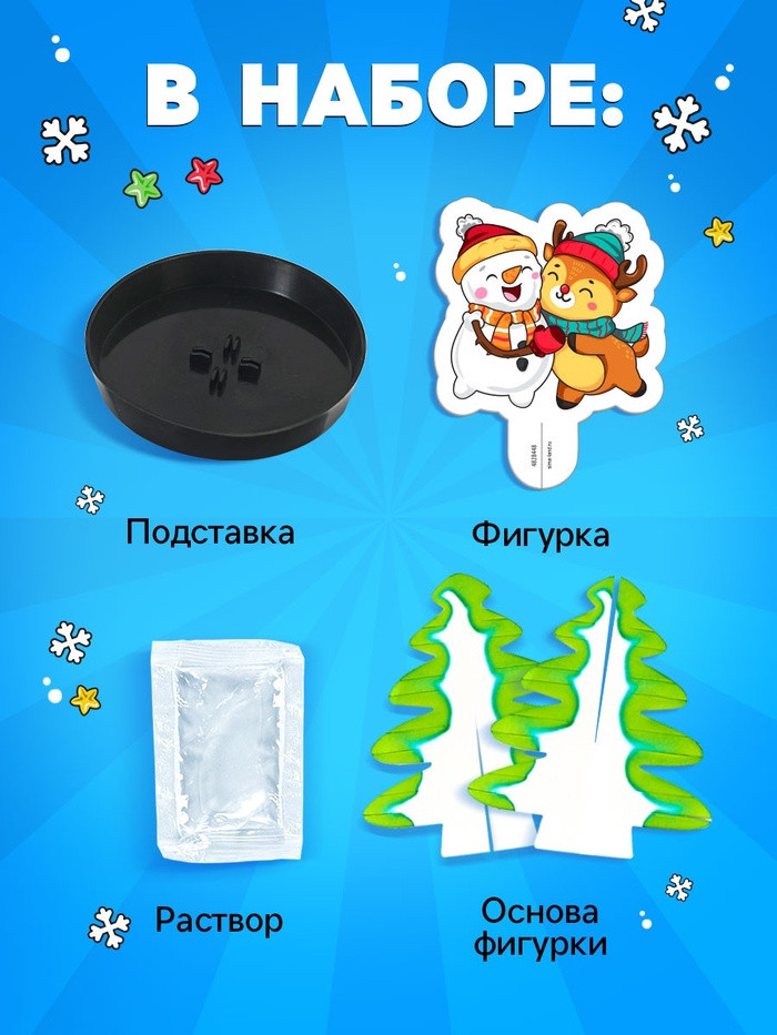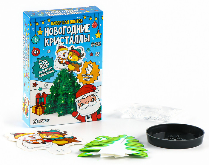 Набор для опытов «Ёлочка. Чудесные кристаллы» — то, что нужно для полезного и интересного досуга! Такой подарок поможет ребёнку скрасить ожидание Нового года, а также позволит создать необычную игрушку и понаблюдать за процессом кристаллизации. Как провести опыт. ? Соберите фигурку, расправьте все детали и установите на подставку. Вылейте раствор в пластиковую подставку. Оставьте фигурку на несколько часов, а лучше на ночь. Готово! Теперь вы можете любоваться результатом своего эксперимента. Инструкция находится на обратной стороне коробки. Все компоненты набора безопасны и безвредны для детей. В коробке уже есть всё, что понадобится для эксперимента. В результате опыта у ребёнка появится игрушка, покрытая кристаллами. Обратите внимание! Кристаллы вырастут только на цветной части конструкции. Рекомендуется для детей от 4 лет. |