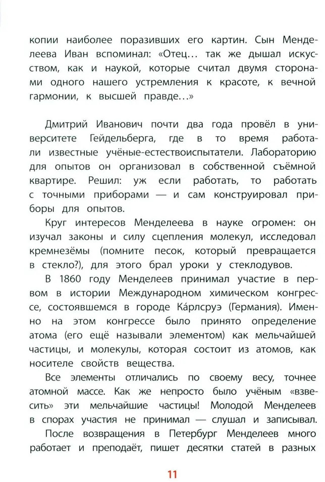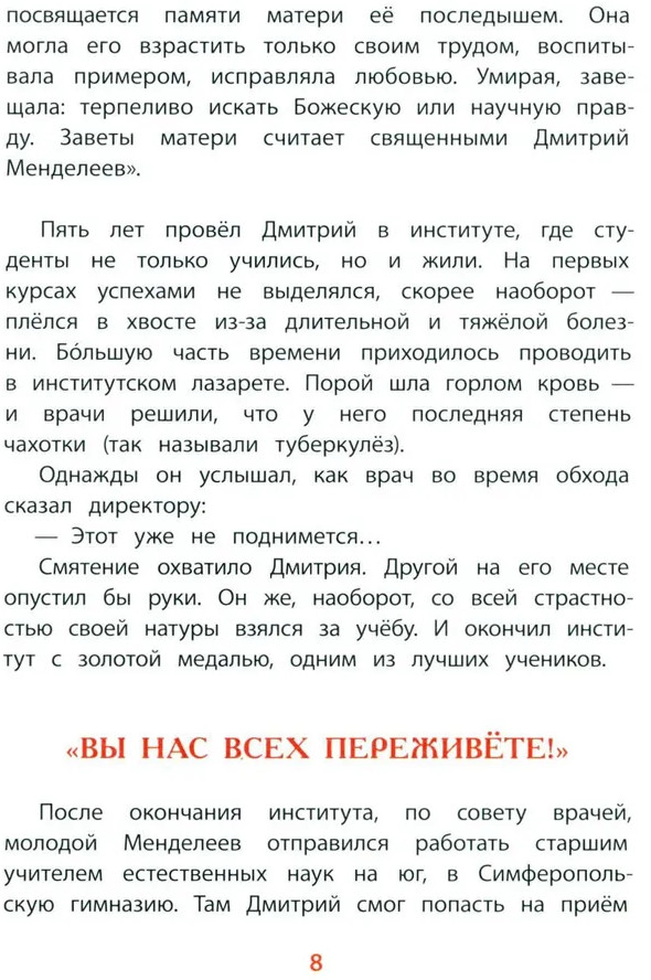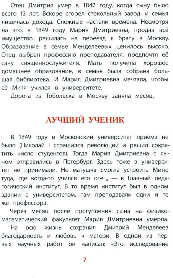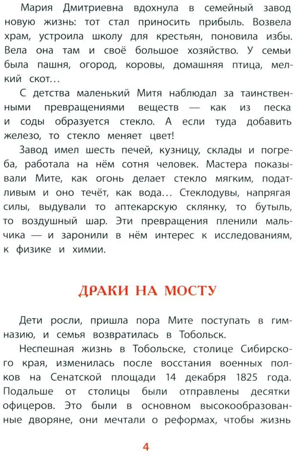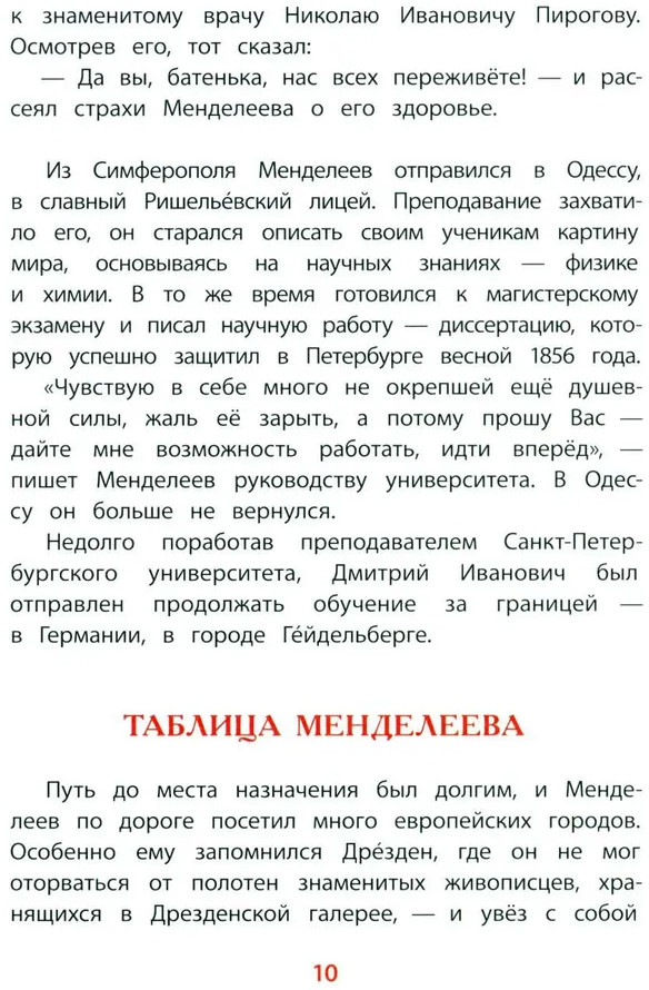 Серия: Детям о великих людях России О чем мы вспоминаем прежде всего, когда произносим имя великого русского учёного Дмитрия Ивановича Менделеева (1834–1907)? Конечно, о его знаменитой таблице химических элементов, которую знают во всём мире. Он открыл закон повторяемости свойств элементов, из которых состоит наш мир, благодаря чему удалось привести накопленные учёными знания в понятную всем систему и предсказать новые открытия. Но интересы Дмитрия Ивановича распространялись намного шире, чем химия и физика. Он изобрёл состав бездымного пороха, писал статьи по искусству, исследовал залежи нефти и руды, разрабатывал проекты добычи земельных богатств. Под руководством Менделеева в нашей стране созданы эталоны веса, длины, температуры, давления, времени и электрических единиц. Это был поистине государственный ум, все свои знания, всю жизнь посвятивший родному Отечеству. Об этой уникальной личности, по масштабу сопоставимой с личностью другого выдающегося учёного — Михаила Васильевича Ломоносова, вы узнаете в этой книге. |