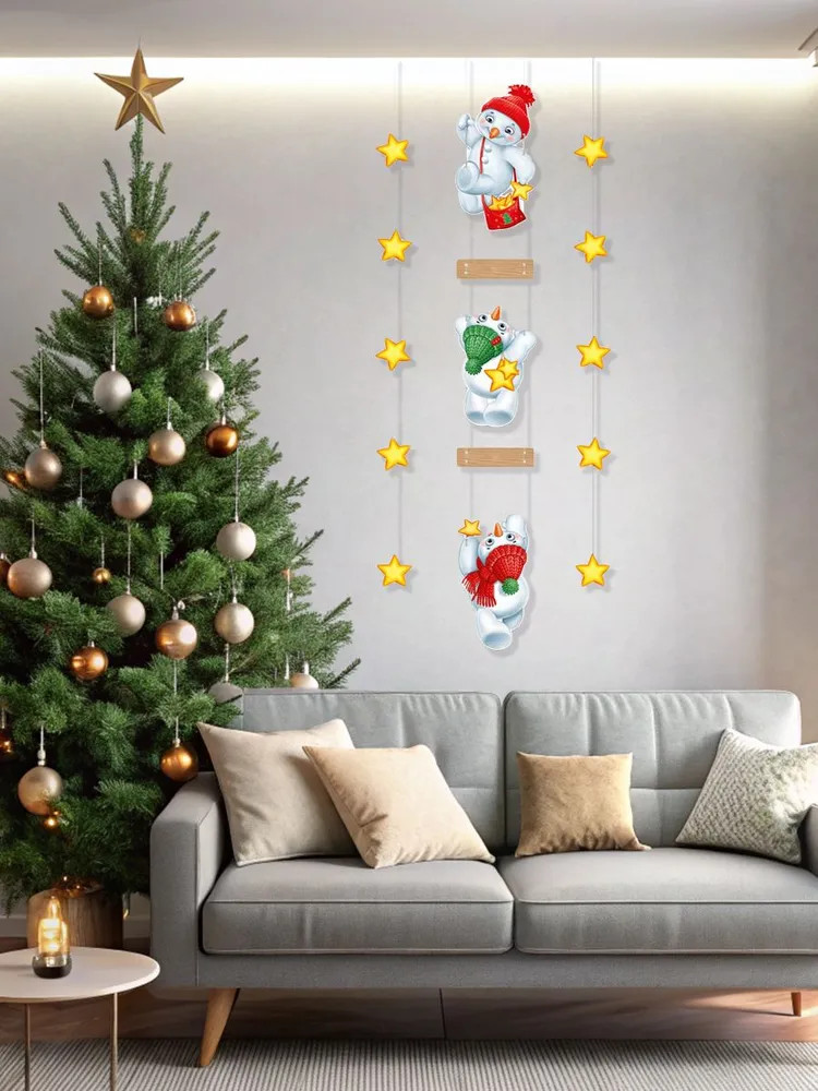 Зимние праздники — это волшебная пора, когда украшают дом и елку, готовят подарки и лепят снеговиков. Но можно не морозить нос и поместить веселый символ зимы у себя в квартире! Двухсторонняя вертикальная гирлянда на нитях с озорными снеговиками и яркими звездами подойдет для оформления дома и детской комнаты, детского сада и школы на Новый год и Рождество. Снеговик считается оберегом от зла пока дуют холодные ветра. А тут их сразу трое!