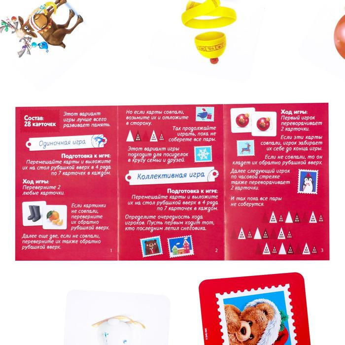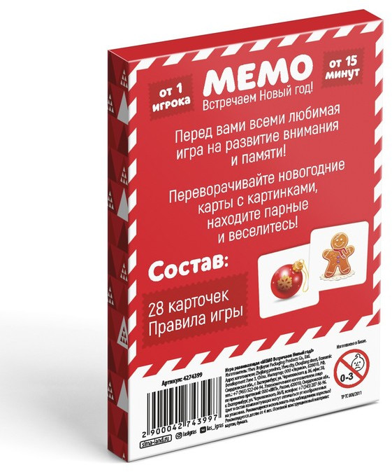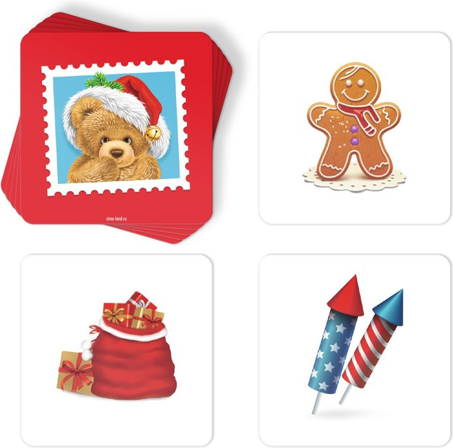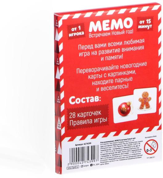 Играем и развиваем память. Перед вами всеми любимая игра «Мемо», с которой Новый год и зимние каникулы пройдут весело и интересно. Переворачивайте парные карточки, развивайте внимание и память и побеждайте! Что нужно делать? Для начала перемешайте карточки и выложите их на столе рубашкой вверх в 4 ряда по 7 карточек в каждом. Определите очерёдность хода. Пусть первым ходит тот, кто последним лепил снеговика. Итак, участники по очереди переворачивают по две карточки. Если они совпали, игрок забирает их себе до конца игры, если не совпали — он кладёт их обратно рубашкой вверх. Далее следующий игрок по часовой стрелке также переворачивает две карточки. И так пока все пары не соберутся. Побеждает тот, кто собрал больше всех карт! Внутри вы найдёте: 28 карточек; правила игры. |
