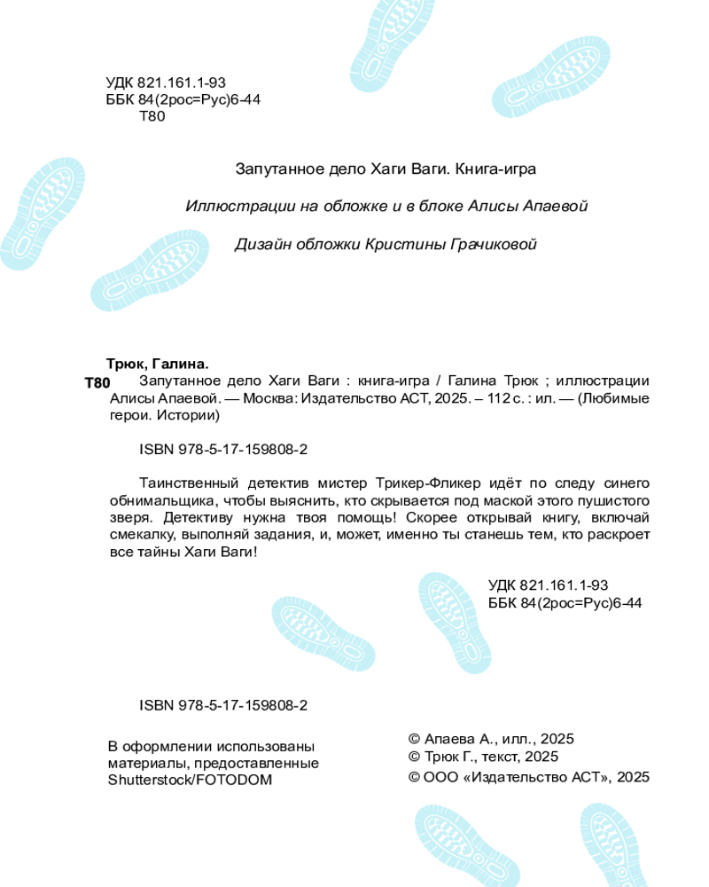 Серия: Любимые герои. Истории Таинственный детектив мистер Трикер-Фликер идёт по следу синего обнимальщика, чтобы выяснить, кто скрывается под маской этого пушистого зверя. Детективу нужна твоя помощь! Скорее открывай книгу, включай смекалку, выполняй задания, и, может, именно ты станешь тем, кто раскроет все тайны Хаги Ваги! |