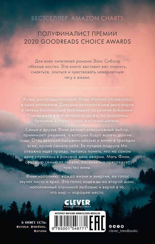 В одно мгновениеновинка В данный момент этот товар отсутствует в продаже. Возможно, у нас найдется аналогичный или похожий товар здесь. Эта книга заставит вас плакать, смеяться и чувствовать невероятную тягу к жизни. Жизнь 16-летней Финн Миллер оборвалась в одно мгновение. Девушка оказалась меж двух миров и теперь беспомощно наблюдает за своими близкими. Они выжили в той автокатастрофе, но оказались брошены в горах среди жестокой метели. Семья и друзья Финн делают невозможный выбор, принимают решения, о которых будут жалеть долгие годы. Отец девушки одержим местью и винит в трагедии всех, кроме самого себя. Ее лучшая подруга Мо отважно ищет правду, пытаясь понять, что на самом деле случилось в роковой день аварии. Мать Финн, спасшую семью от гибели, бесконечно преследует чувство вины. Финн наполняют жажда жизни и энергия, ее голос звучит чисто и ярко. Это голос надежды на второй шанс, наполненный огромной любовью и верой в то, что мир — хорошее место. Книга — бестселлер Amazon Charts, полуфиналист премии 2020 Goodreads Choice Awards. Для всех читателей романа Элис Сиболд «Милые кости». |