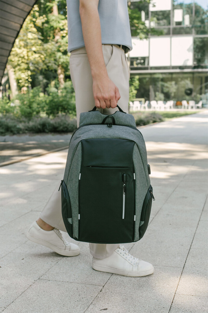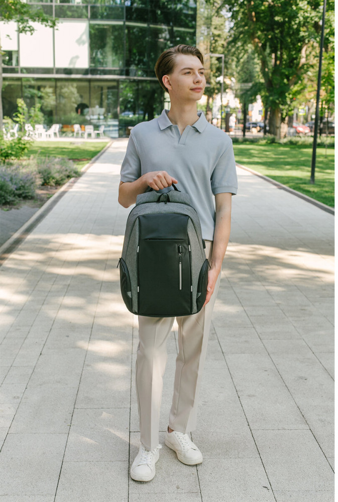 Рюкзак серии Modern создан для тех, кто ценит надежность, комфорт и стиль. Выполнен из серого полиэстера с чёрной водоотталкивающей вставкой вдоль всей передней панели а также на боковых карманах, что гарантированно обеспечивает защиту техники и личных вещей от дождя и влаги. Размеры 43×30×12 см, объем 15 литров, вес 700 грамм — он достаточно просторен для ежедневных нужд.