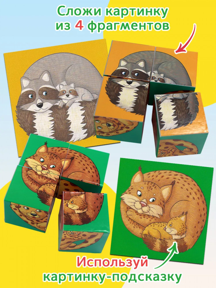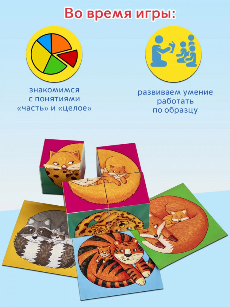 Серия: IQ Кубики Набор состоит из 4 кубиков размером 4×4 см. Ребёнку нужно сложить картинку из 4 фрагментов. В качестве подсказки даны 6 картинок с изображением животных — мамы и малыша. Картинка кладётся на дно коробочки, и ребёнок ставит на неё нужные кубики. |