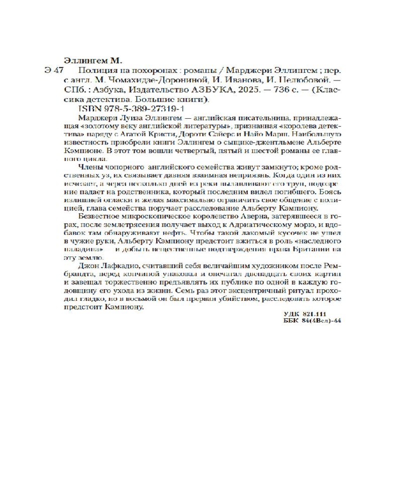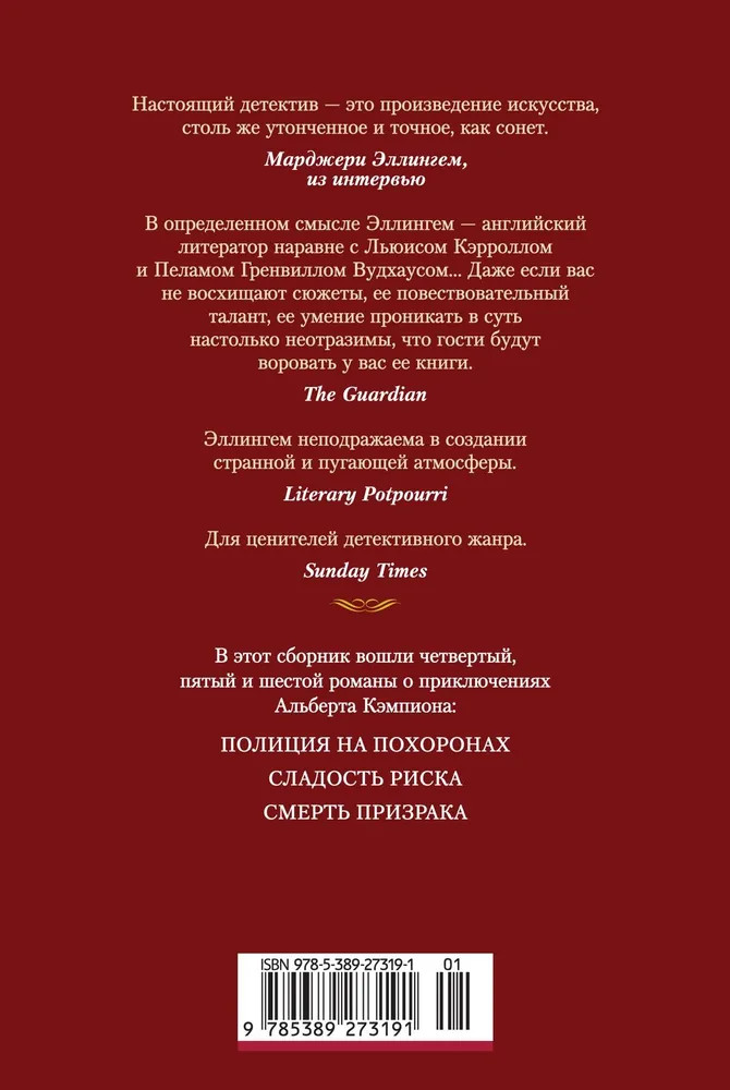 Серия: Классика детектива. Большие книги Марджери Луиза Эллингем — английская писательница, принадлежащая «золотому веку английской литературы», признанная «королева детектива» наряду с Агатой Кристи, Дороти Сэйерс и Найо Марш. Наибольшую известность приобрели книги Эллингем о сыщике-джентльмене Альберте Кэмпионе. В этот том вошли четвертый, пятый и шестой романы ее главного цикла.