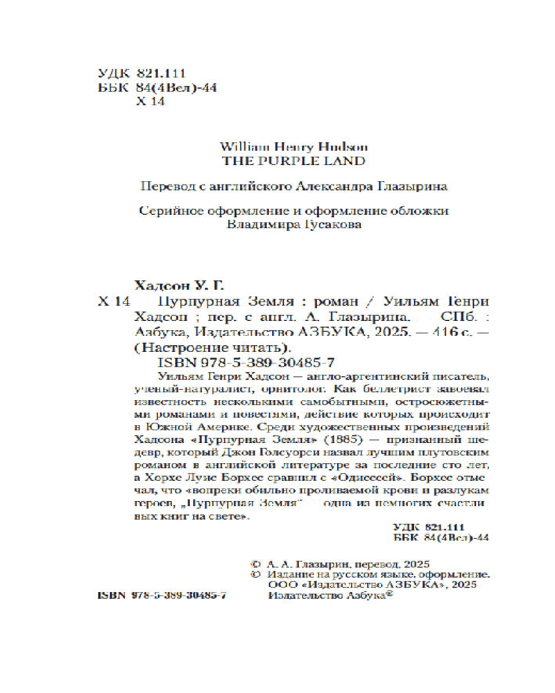 Серия: Настроение читать Уильям Генри Хадсон — англо-аргентинский писатель, ученый-натуралист, орнитолог. Как беллетрист завоевал известность несколькими самобытными, остросюжетными романами и повестями, действие которых происходит в Южной Америке. Среди художественных произведений Хадсона «Пурпурная Земля» (1885) — признанный шедевр, который Джон Голсуорси назвал лучшим плутовским романом в английской литературе за последние сто лет, а Хорхе Луис Борхес сравнил с «Одиссеей». Борхес отмечал, что «вопреки обильно проливаемой крови и разлукам героев, «Пурпурная Земля» — одна из немногих счастливых книг на свете». |