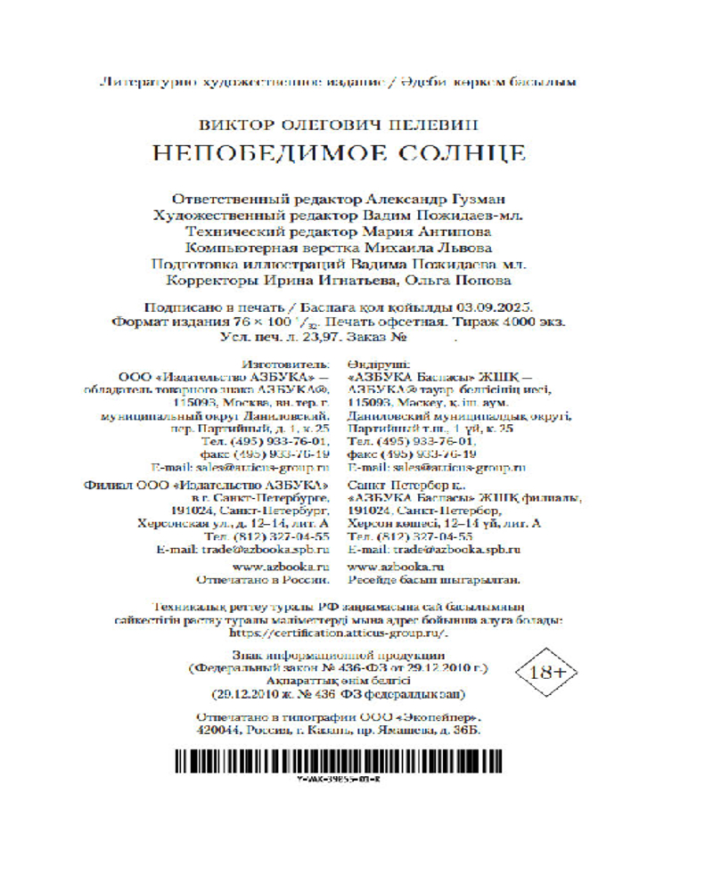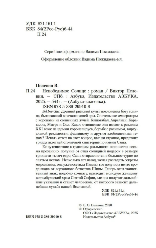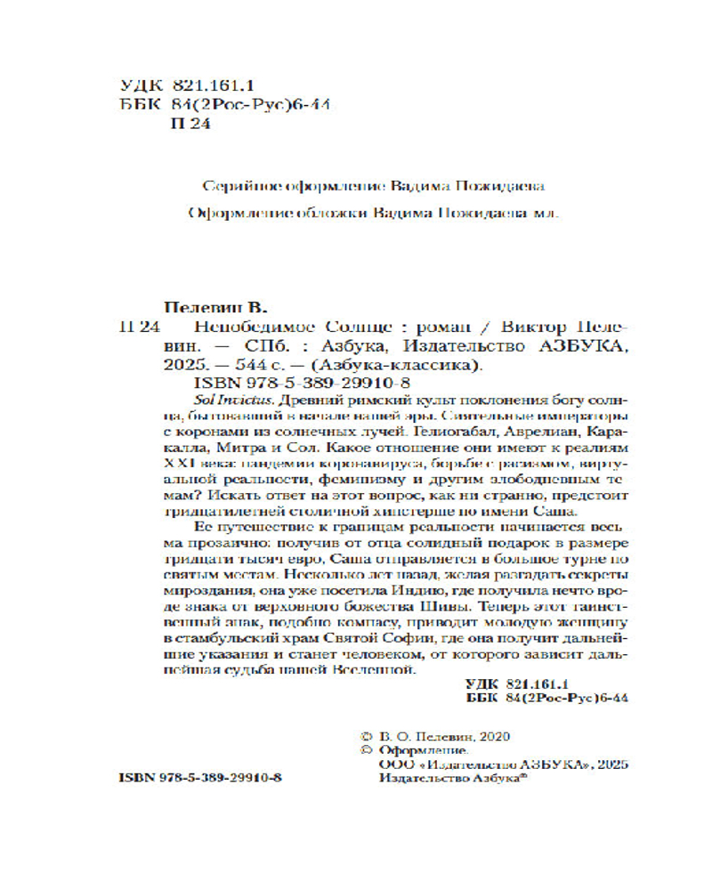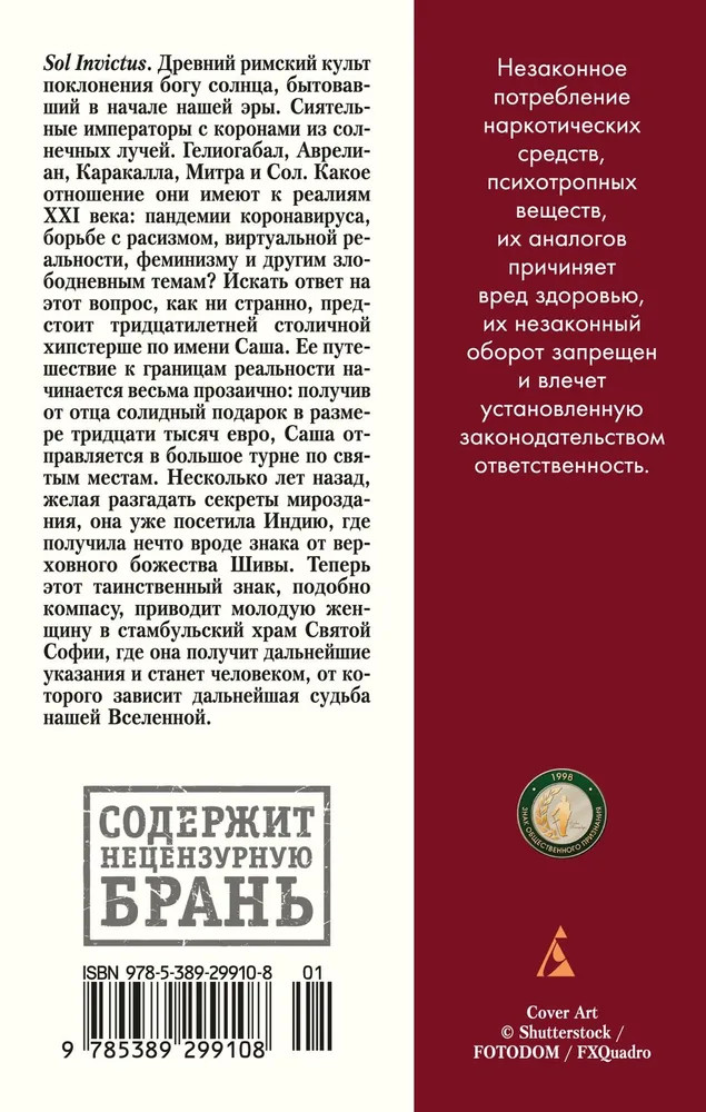Серия: Азбука-классика (pocket-book) Sol Invictus. Древний римский культ поклонения богу солнца, бытовавший в начале нашей эры. Сиятельные императоры с коронами из солнечных лучей. Гелиогабал, Аврелиан, Каракалла, Митра и Сол. Какое отношение они имеют к реалиям XXI века: пандемии коронавируса, борьбе с расизмом, виртуальной реальности, феминизму и другим злободневным темам? Искать ответ на этот вопрос, как ни странно, предстоит тридцатилетней столичной хипстерше по имени Саша. |