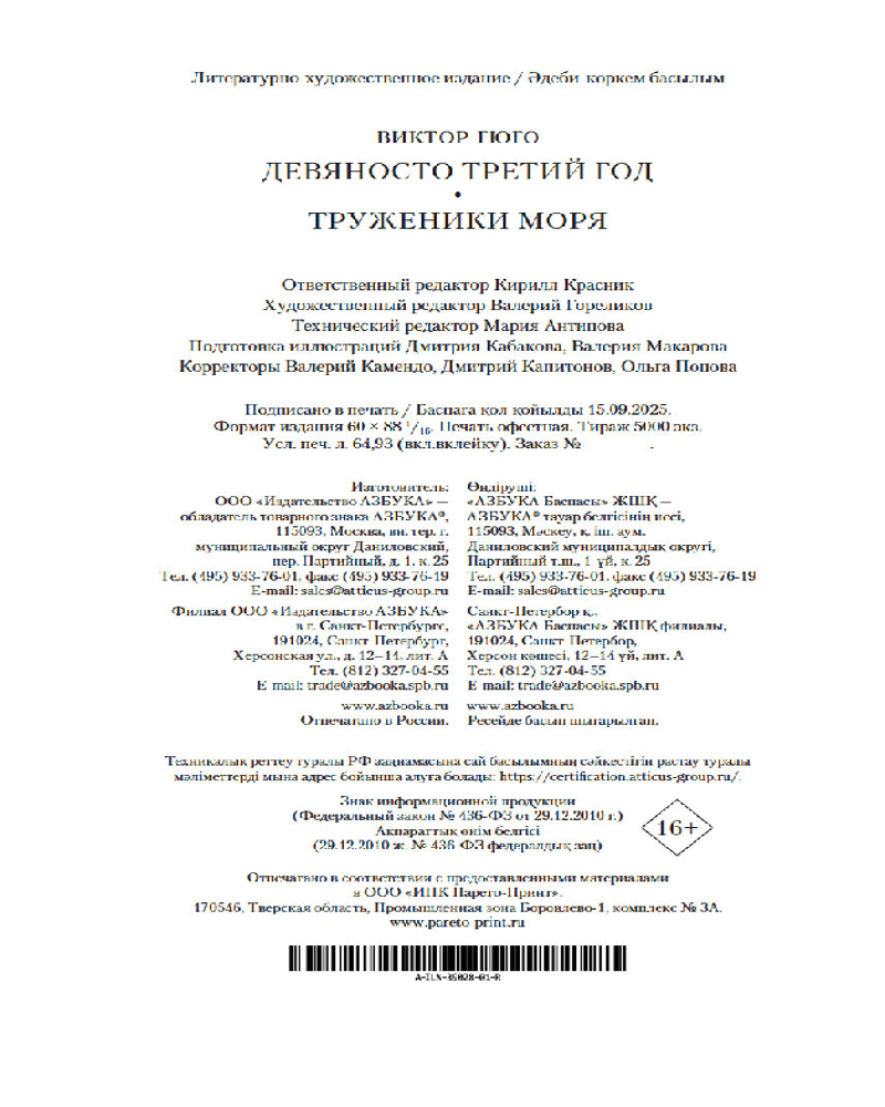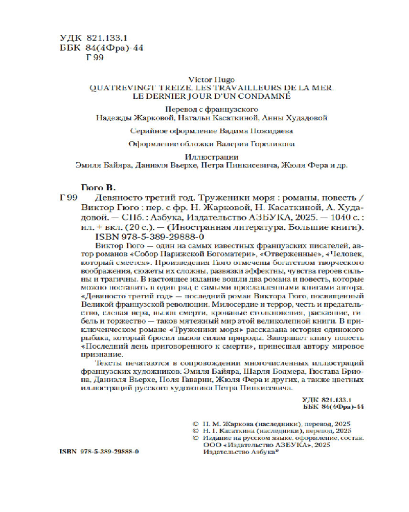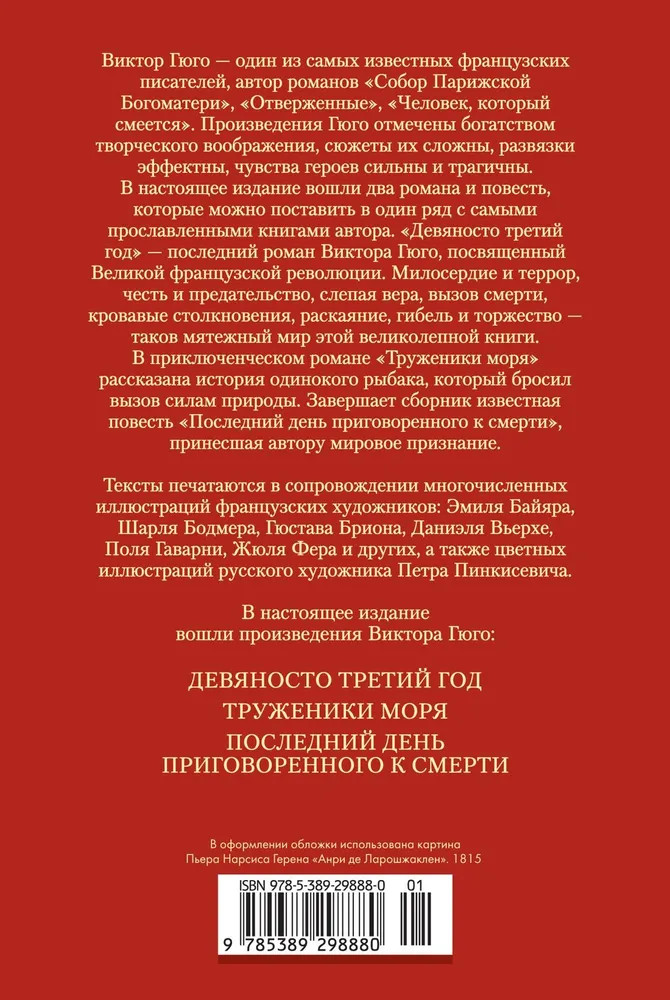 Серия: Иностранная литература. Большие книги Виктор Гюго — один из самых известных французских писателей, автор романов «Собор Парижской Богоматери», «Отверженные», «Человек, который смеется». Произведения Гюго отмечены богатством творческого воображения, сюжеты их сложны, развязки эффектны, чувства героев сильны и трагичны. В настоящее издание вошли два романа и повесть, которые можно поставить в один ряд с самыми прославленными книгами автора. «Девяносто третий год» — последний роман Виктора Гюго, посвященный Великой французской революции. Милосердие и террор, честь и предательство, слепая вера, вызов смерти, кровавые столкновения, раскаяние, гибель и торжество — таков мятежный мир этой великолепной книги. В приключенческом романе «Труженики моря» рассказана история одинокого рыбака, который бросил вызов силам природы. Завершает книгу повесть «Последний день приговоренного к смерти», принесшая автору мировое признание. |