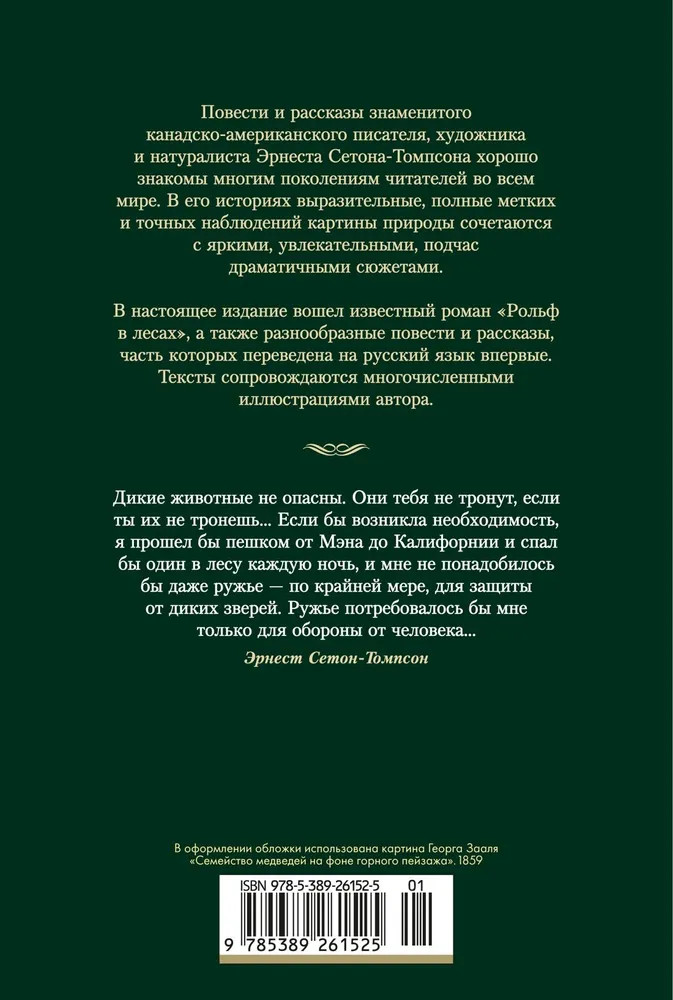 Серия: Иностранная литература. Большие книги Повести и рассказы знаменитого канадско-американского писателя, художника и натуралиста Эрнеста Сетона-Томпсона хорошо знакомы многим поколениям читателей во всем мире. В его историях выразительные, полные метких и точных наблюдений картины природы сочетаются с яркими, увлекательными, подчас драматичными сюжетами. В настоящее издание вошел известный роман «Рольф в лесах», а также разнообразные повести и рассказы, часть которых переведена на русский язык впервые. Тексты сопровождаются многочисленными иллюстрациями автора. |
