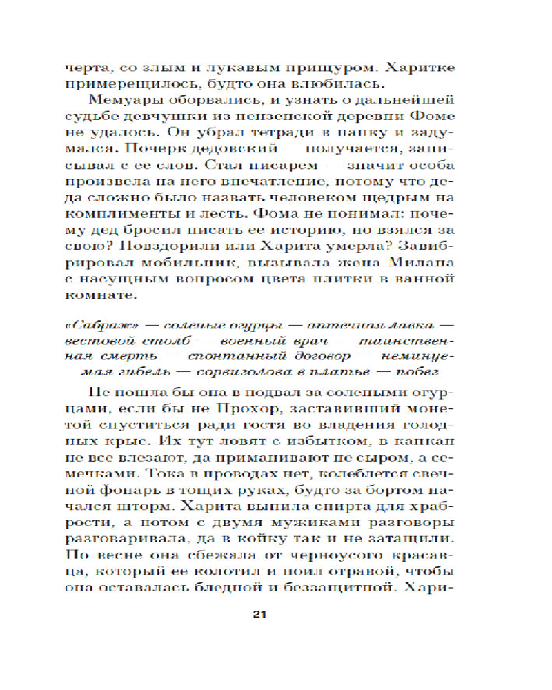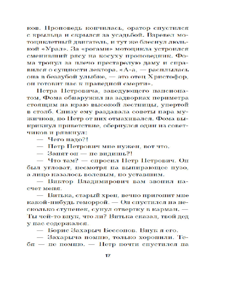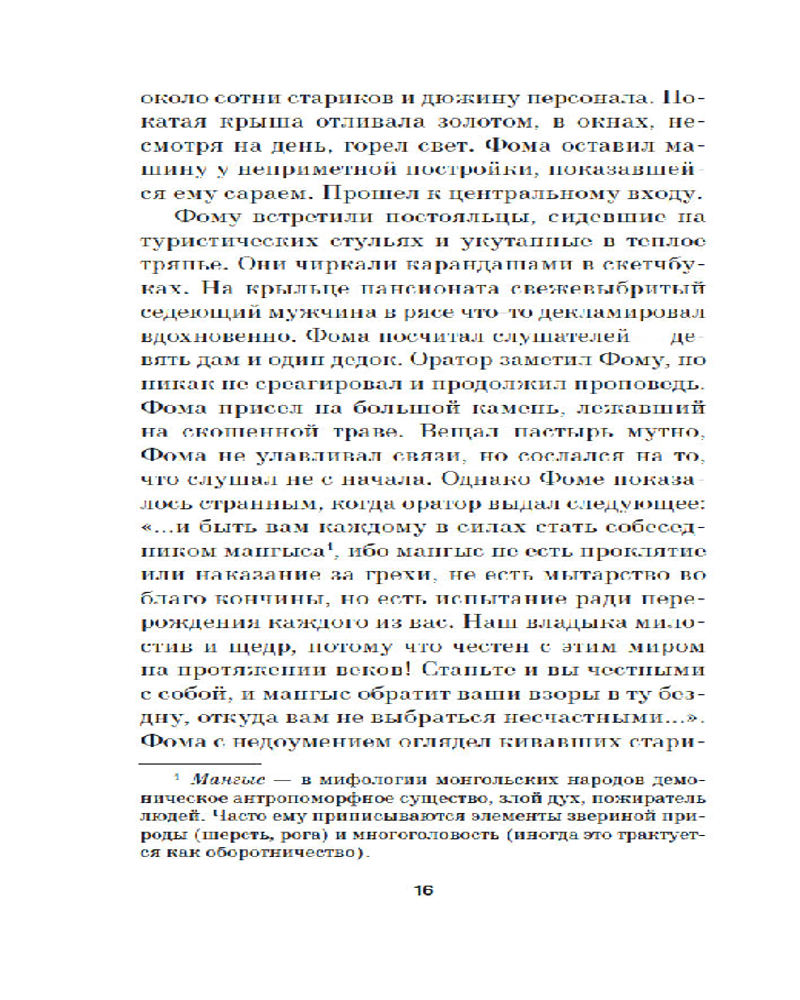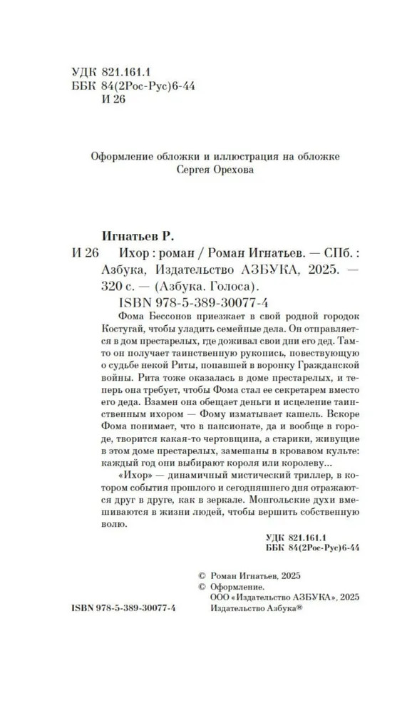 Серия: Азбука. Голоса Фома Бессонов приезжает в свой родной городок Костугай, чтобы уладить семейные дела. Он отправляется в дом престарелых, где доживал свои дни его дед. Там-то он получает таинственную рукопись, повествующую о судьбе некой Риты, попавшей в воронку Гражданской войны. Рита тоже оказалась в доме престарелых, и теперь она требует, чтобы Фома стал ее секретарем вместо его деда. Взамен она обещает деньги и исцеление таинственным ихором — Фому изматывает кашель. Вскоре Фома понимает, что в пансионате, да и вообще в городе, творится какая-то чертовщина, а старики, живущие в этом доме престарелых, замешаны в кровавом культе: каждый год они выбирают короля или королеву... |