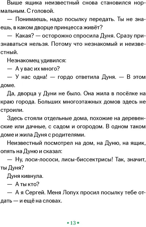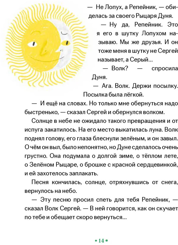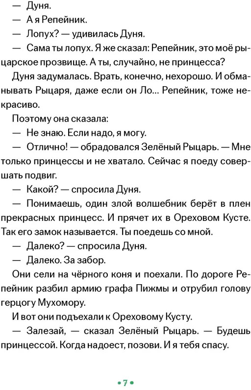 Дуня живёт с мамой и папой в доме на окраине города. Самый обычный дом, похожий на деревенский. Самый обычный сад... Но стоит взрослым отвернуться, как всё вокруг преображается и наполняется удивительными существами. Рыцарь Репейник ухаживает за Принцессой Дуней и хочет на ней жениться. Верная Кузябра всегда тут как тут, готова дать совет или прочитать чьи-то мысли. Господин Бардак следит за тем, чтобы Дуня не слишком увлекалась порядком в своей комнате. Дуня никогда не скучает: она ведёт борьбу с Чёрным Царём и летает на зонтике, общается с Инопланетянином и принимает участие в конкурсе принцесс. Не за горами Первое сентября, и Дуне придётся отправиться в школу. Забудет ли она своих необычных друзей и знакомцев? Истории о силе воображения и вере в чудеса придутся по душе маленьким фантазёрам и заставят улыбнуться взрослых — даже самых серьёзных! |