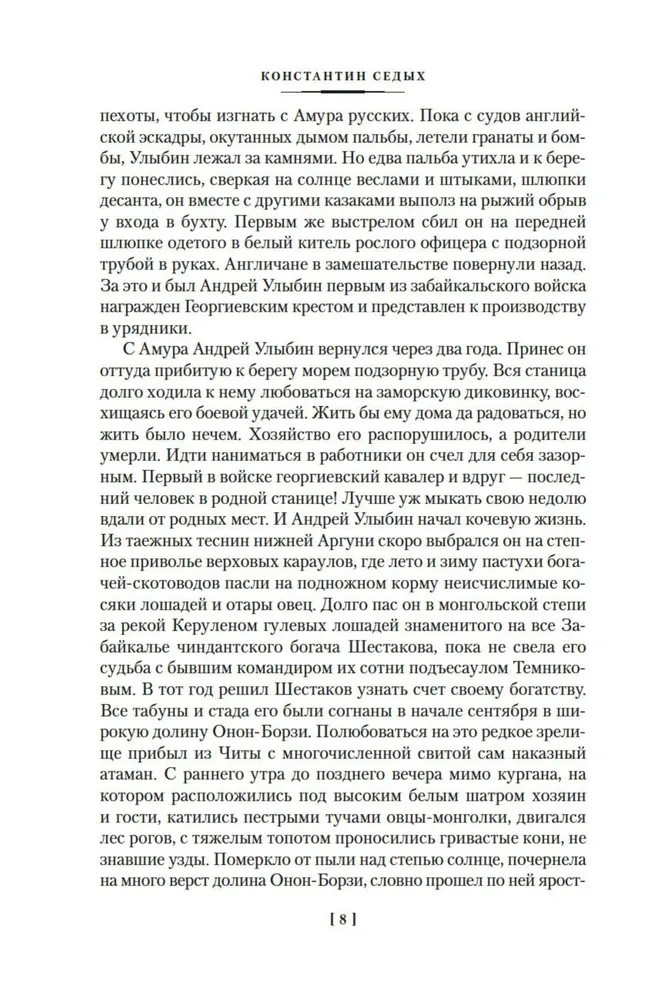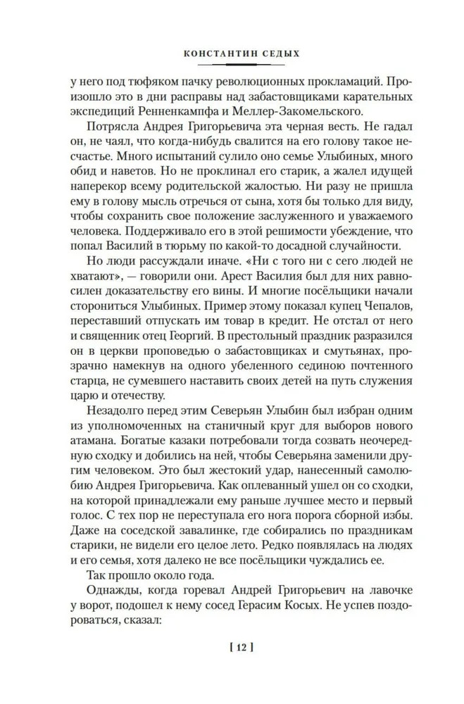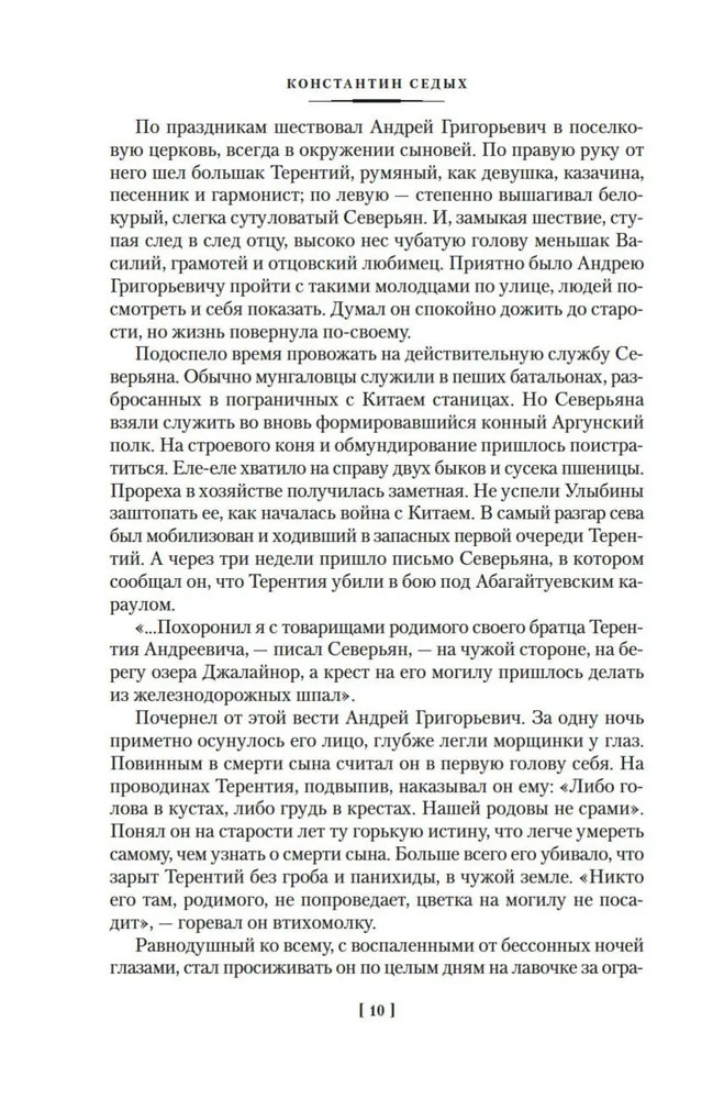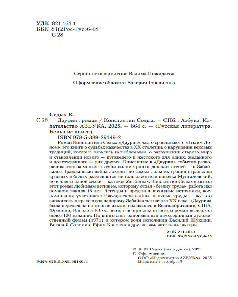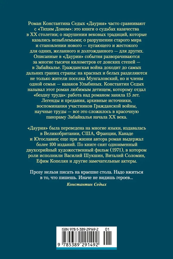Серия: Русская литература. Большие книги Роман Константина Седых «Даурия» часто сравнивают с «Тихим Доном»: это книги о судьбах казачества в XX столетии; о нарушении вековых традиций, которые казались незыблемыми; о разрушении старого мира и становлении нового — пугающего и жестокого для одних, желанного и долгожданного — для других. Описанные в «Даурии» события разворачиваются за многие тысячи километров от донских степей — в Забайкалье. Гражданская война доходит до самых дальних границ страны: на красных и белых разделяются не только жители поселка Мунгаловский, но и члены одной семьи — казаков Улыбиных. Константин Седых называл этот роман любимым детищем, которому отдал «бездну труда»: работа над романом заняла 15 лет. Легенды и предания, архивные источники, воспоминания участников Гражданской войны, научные труды — все это сложилось в красочную панораму Забайкалья начала XX века. «Даурия» была переведена на многие языки, издавалась в Великобритании, США, Франции, Канаде и Югославии; еще при жизни автора роман выдержал более 100 изданий. По книге снят одноименный двухсерийный художественный фильм (1971), в котором роли исполнили Василий Шукшин, Виталий Соломин, Ефим Копелян и другие замечательные актеры. |