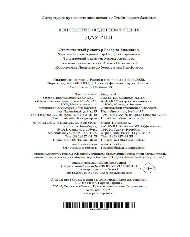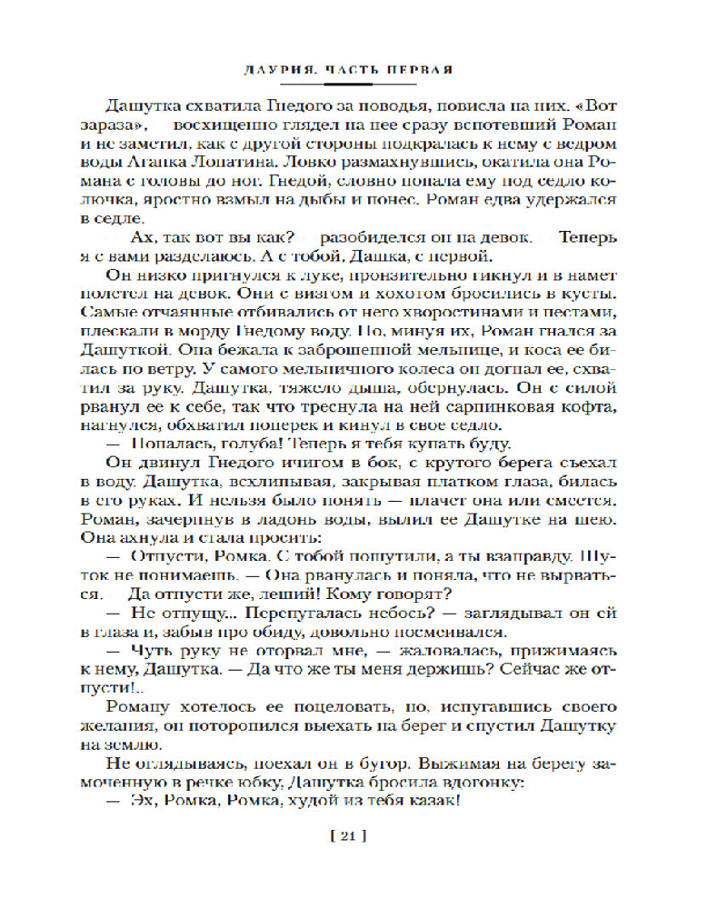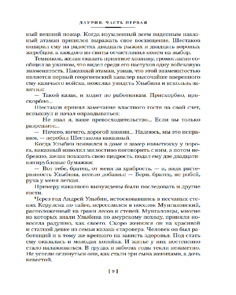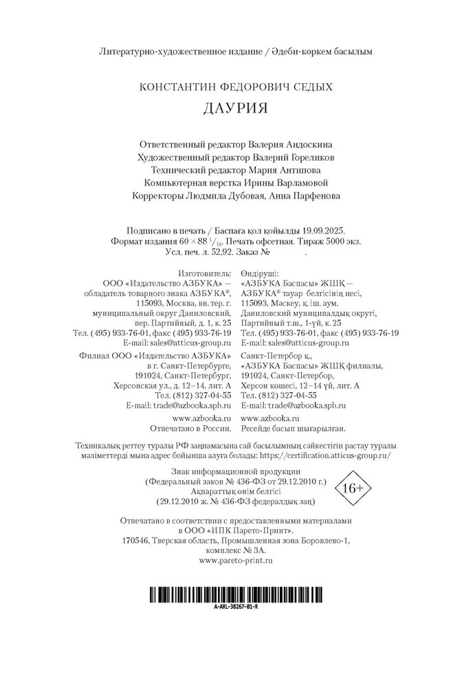 Серия: Русская литература. Большие книги Роман Константина Седых «Даурия» часто сравнивают с «Тихим Доном»: это книги о судьбах казачества в XX столетии; о нарушении вековых традиций, которые казались незыблемыми; о разрушении старого мира и становлении нового — пугающего и жестокого для одних, желанного и долгожданного — для других. Описанные в «Даурии» события разворачиваются за многие тысячи километров от донских степей — в Забайкалье. Гражданская война доходит до самых дальних границ страны: на красных и белых разделяются не только жители поселка Мунгаловский, но и члены одной семьи — казаков Улыбиных. Константин Седых называл этот роман любимым детищем, которому отдал «бездну труда»: работа над романом заняла 15 лет. Легенды и предания, архивные источники, воспоминания участников Гражданской войны, научные труды — все это сложилось в красочную панораму Забайкалья начала XX века. «Даурия» была переведена на многие языки, издавалась в Великобритании, США, Франции, Канаде и Югославии; еще при жизни автора роман выдержал более 100 изданий. По книге снят одноименный двухсерийный художественный фильм (1971), в котором роли исполнили Василий Шукшин, Виталий Соломин, Ефим Копелян и другие замечательные актеры. |