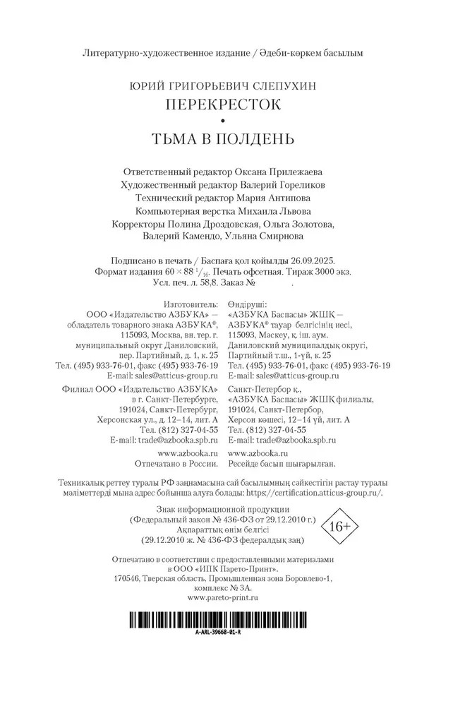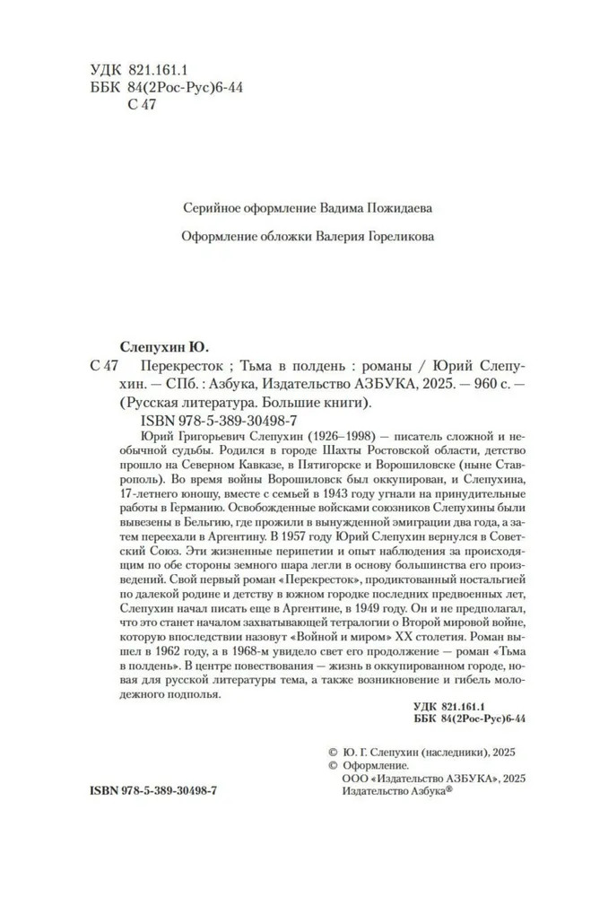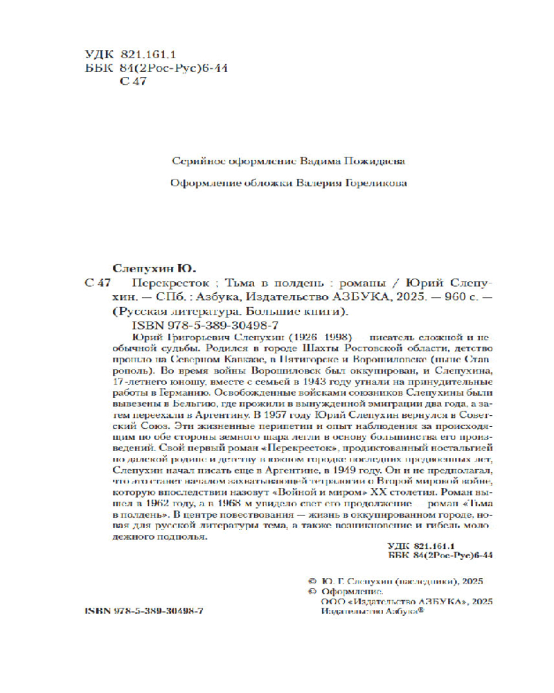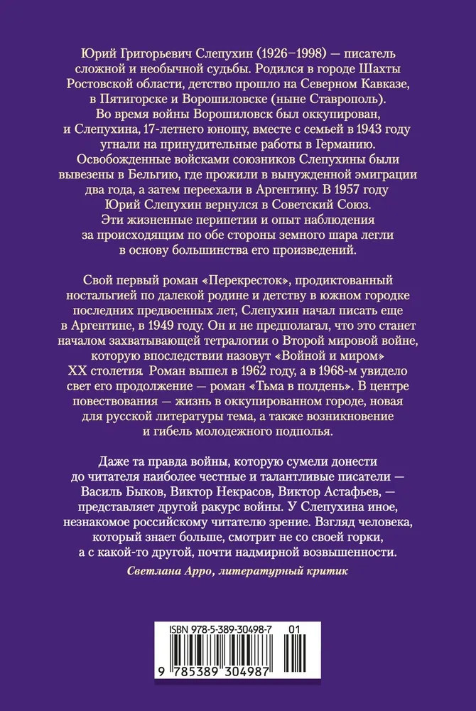 Серия: Русская литература. Большие книги Юрий Григорьевич Слепухин (1926–1998) — писатель сложной и необычной судьбы. Родился в городе Шахты Ростовской области, детство прошло на Северном Кавказе, в Пятигорске и Ворошиловске (ныне Ставрополь). Во время войны Ворошиловск был оккупирован, и Слепухина, 17-летнего юношу, вместе с семьей в 1943 году угнали на принудительные работы в Германию. Освобожденные войсками союзников Слепухины были вывезены в Бельгию, где прожили в вынужденной эмиграции два года, а затем переехали в Аргентину. В 1957 году Юрий Слепухин вернулся в Советский Союз. Эти жизненные перипетии и опыт наблюдения за происходящим по обе стороны земного шара легли в основу большинства его произведений. Свой первый роман «Перекресток», продиктованный ностальгией по далекой родине и детству в южном городке последних предвоенных лет, Слепухин начал писать еще в Аргентине, в 1949 году. Он и не предполагал, что это станет началом захватывающей тетралогии о Второй мировой войне, которую впоследствии назовут «Войной и миром» XX столетия. Роман вышел в 1962 году, а в 1968-м увидело свет его продолжение — роман «Тьма в полдень». В центре повествования — жизнь в оккупированном городе, новая для русской литературы тема, а также возникновение и гибель молодежного подполья. |