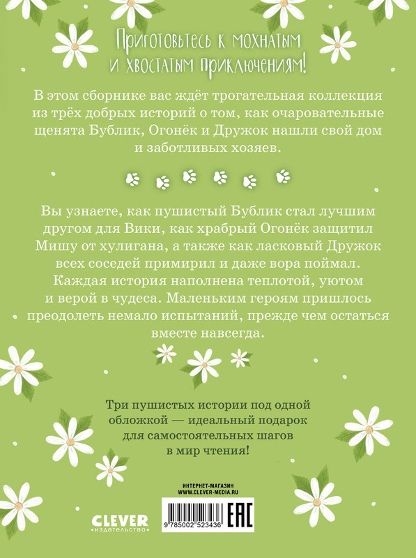 💳 Оплатить за товар можно при получении 🇰🇿 Есть бесплатная доставка по Казахстану 🎁 Копите бонусы с каждой покупки Приготовьтесь к мохнатым и хвостатым приключениям! В этом сборнике вас ждёт трогательная коллекция из трёх добрых историй о том, как очаровательные щенята Бублик, Огонёк и Дружок нашли свой дом и заботливых хозяев. Вы узнаете, как пушистый Бублик стал лучшим другом для Вики, как храбрый Огонёк защитил Мишу от хулигана, а также как ласковый Дружок всех соседей примирил и даже вора поймал. Каждая история наполнена теплотой, уютом и верой в чудеса. Маленьким героям пришлось преодолеть немало испытаний, прежде чем остаться вместе навсегда. Три пушистых истории под одной обложкой — идеальный подарок для самостоятельных шагов в мир чтения! |