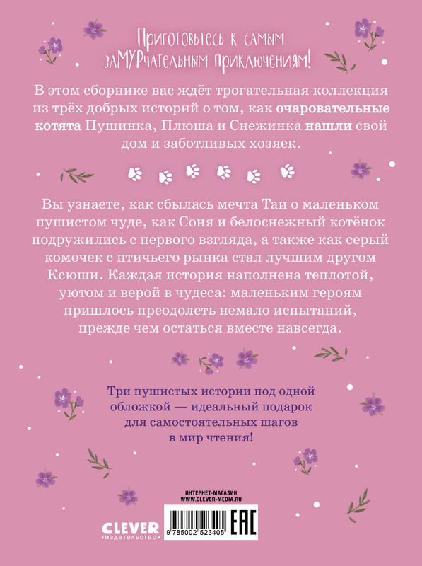 Приготовьтесь к самым заМУРчательным приключениям! В этом сборнике вас ждёт трогательная коллекция из трёх добрых историй о том, как очаровательные котята Пушинка, Плюша и Снежинка нашли свой дом и заботливых хозяек. Вы узнаете, как сбылась мечта Таи о маленьком пушистом чуде, как Соня и белоснежный котёнок подружились с первого взгляда, а также как серый комочек с птичьего рынка стал лучшим другом Ксюши. Каждая история наполнена теплотой, уютом и верой в чудеса: маленьким героям пришлось преодолеть немало испытаний, прежде чем остаться вместе навсегда. Три пушистых истории под одной обложкой — идеальный подарок для самостоятельных шагов в мир чтения!