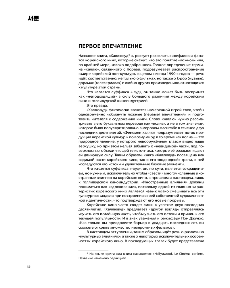 Серия: Кинематограф Азии «Корейское кино рождается на стыке жанров. Мы не боимся смешивать кричащую сатиру с немым ужасом, кровавый триллер с семейной мелодрамой. В этой жанровой неразберихе и рождается наша уникальность». — Пон Джун-хо, режиссер «Паразитов», «Воспоминаний об убийстве». Хотите раз и навсегда разобраться в истории корейских фильмов? Или понять, почему они вызывают такой широкий спектр эмоций? А узнать, в чём различие между «бенши», «пхансори» и «ариран»? Если ваша голова уже идет кругом, то смело берите книгу «Корейское кино. От первых кадров до „Игры в кальмара“» в руки. Ваше путешествие по корейскому кинематографу начинается прямо сейчас! |