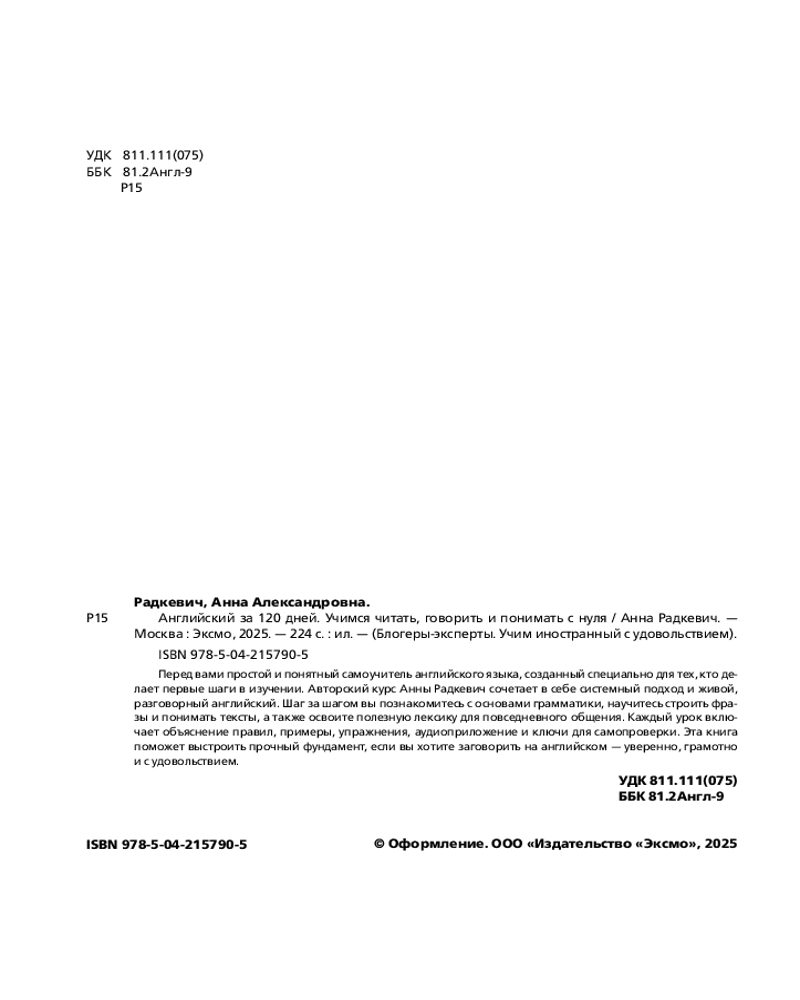 Серия: Блогеры-эксперты. Учим иностранный с удовольствием Начни учить английский — легко, понятно и с удовольствием! Ты давно хотел выучить английский, но не знал, с чего начать? Этот самоучитель — идеальный старт! Автор книги — Анна Радкевич, опытный преподаватель и создательница популярного блога, разработала методику, которая помогает новичкам не запутаться в грамматике и сразу начать говорить. |
