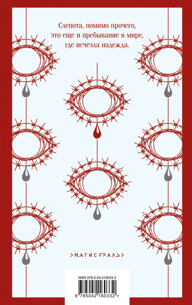 Серия: Магистраль. Главный тренд Нулевой пациент внезапно слепнет, остановившись на светофоре. Сердобольный гражданин довозит его до дома и угоняет машину. На следующий день врач проверяет глаза ослепшего и не понимает, в чем причина. Через несколько часов белая слепота настигает вора, затем доктора, а потом и всех, кто контактировал с ними. Пандемию не остановить. Только жена врача не теряет зрение. Но это проклятие, а не благословение. Она увидит, как люди потеряют человеческий облик, как грязь поглотит город и как проблеснет луч надежды...  |