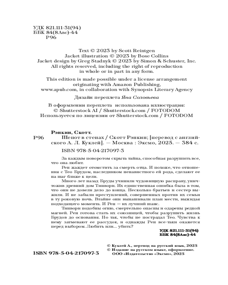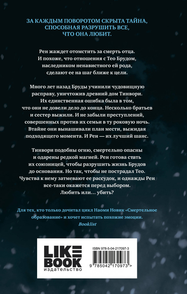 Серия: Young Adult. Смертельная академия Рен жаждет отомстить за смерть отца. И похоже, что отношения с Тео Брудом, наследником ненавистного ей рода, сделают ее на шаг ближе к цели. Много лет назад Бруды учинили чудовищную расправу, уничтожив древний дом Тинвори. Их единственная ошибка была в том, что они не довели дело до конца. Несколько братьев и сестер выжили. И не забыли преступлений, совершенных против их семьи в ту роковую ночь. Втайне они вынашивали план мести, выжидая подходящего момента. И Рен — их лучший шанс. |