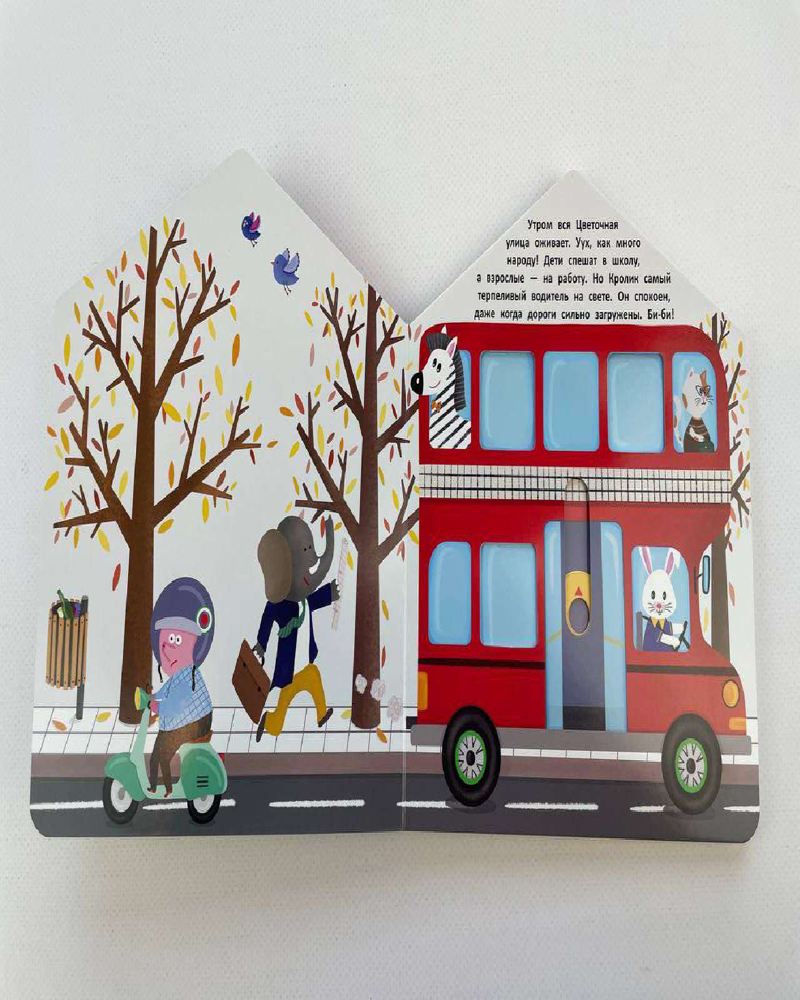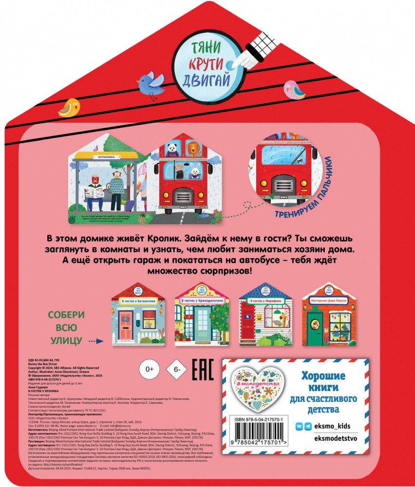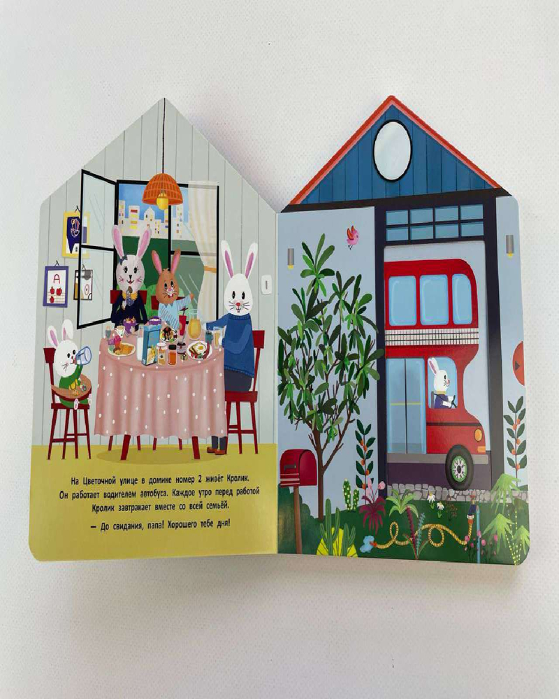 Серия: Pop-up панорамки Добро пожаловать в гости к Кролику! В этой интерактивной книжке-игрушке много сюрпризов: малыш сможет заглянуть в комнаты домика и узнать, чем любит заниматься дружелюбный хозяин. А ещё открыть гараж и покататься на автобусе. Интерактивные элементы помогают развивать мелкую моторику. Ребёнок сможет потянуть, покрутить и подвигать детали, тренируя пальчики. Книжки-игрушки предназначены для детей до 3-х лет, их приятно читать перед сном. Яркие иллюстрации, необычный формат и качественные материалы делают книгу отличным подарком по любому поводу. Соберите всю серию книжек-домиков Цветочной улицы: «В гостях у Бегемотика», «В гостях у Крокодильчика», «В гостях у Жирафика», «Мастерская Деда Мороза». |