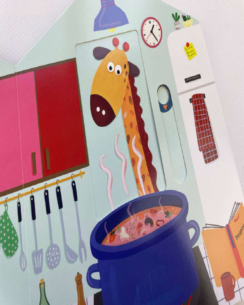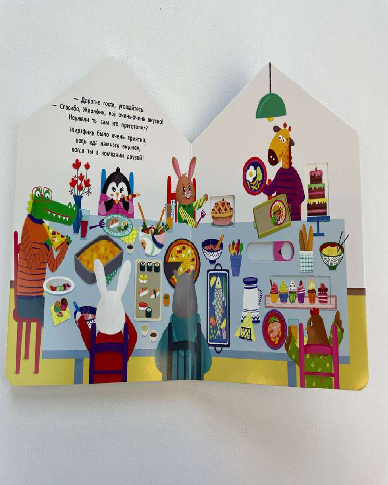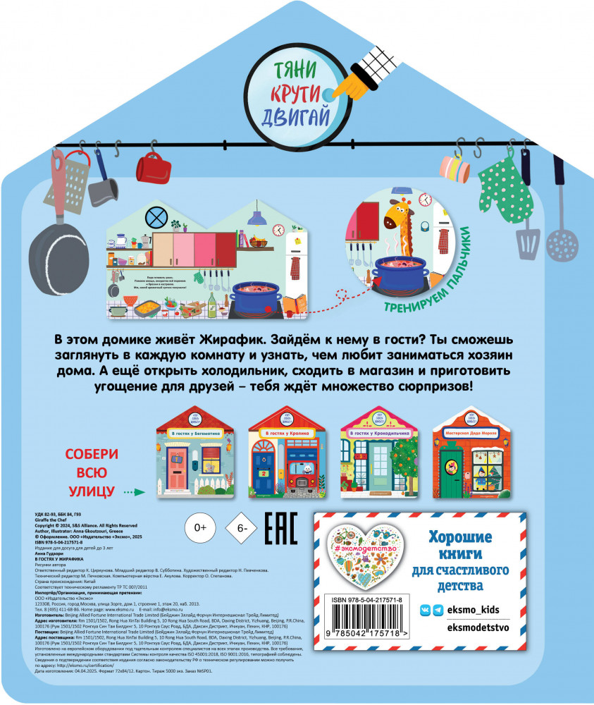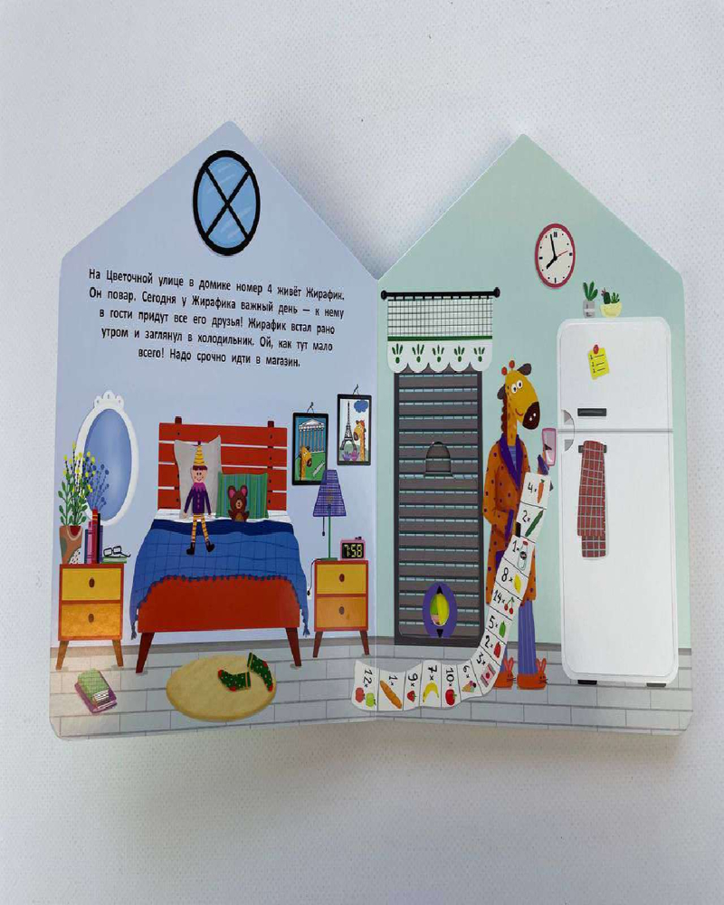 Добро пожаловать в гости к Жирафику! В этой интерактивной книжке-игрушке много сюрпризов: малыш сможет заглянуть в каждую комнату домика и узнать, чем любит заниматься дружелюбный хозяин. А ещё открыть холодильник, сходить в магазин и приготовить угощение для друзей. Интерактивные элементы помогают развивать мелкую моторику. Ребёнок сможет потянуть, покрутить и подвигать детали, тренируя пальчики. Книжки-игрушки предназначены для детей до 3-х лет, их приятно читать перед сном. Яркие иллюстрации, необычный формат и качественные материалы делают книгу отличным подарком по любому поводу. Соберите всю серию книжек-домиков Цветочной улицы: «В гостях у Бегемотика», «В гостях у Кролика», «В гостях у Крокодильчика», «Мастерская Деда Мороза».