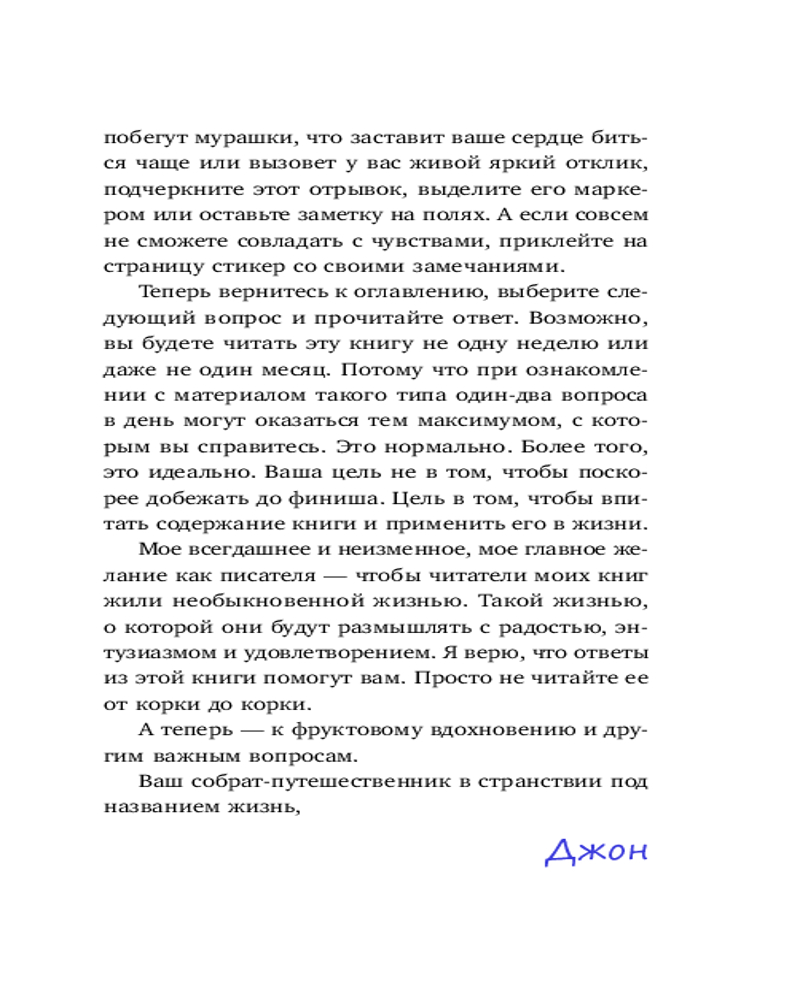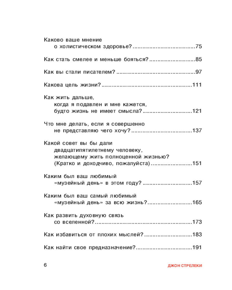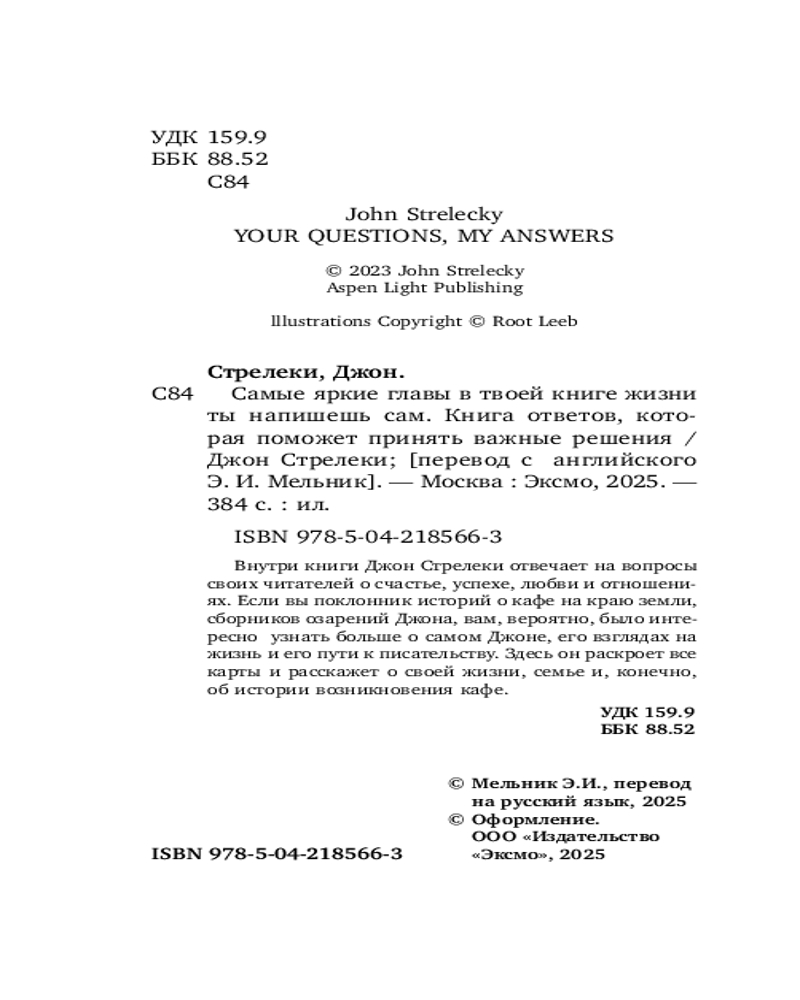 Серия: Кафе на краю земли. Вдохновляющие открытия Джона Стрелеки Новая книга-откровение от Джона Стрелеки. Она станет бесценным подарком для поклонников историй о кафе на краю земли, ведь в ней Джон отвечает на самые насущные (и даже на немного странные) вопросы читателей, раскрывает подробности своей биографии и рассказывает, что позволило ему написать истории, которые стали любимы людьми по всему миру. В этом искреннем рассказе читатели найдут рецепты счастья, поддержку, освобождение от страхов и, конечно, фирменную простую философию жизни, которая поможет принять правильные решения, близкие сердцу. |