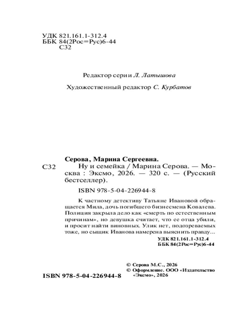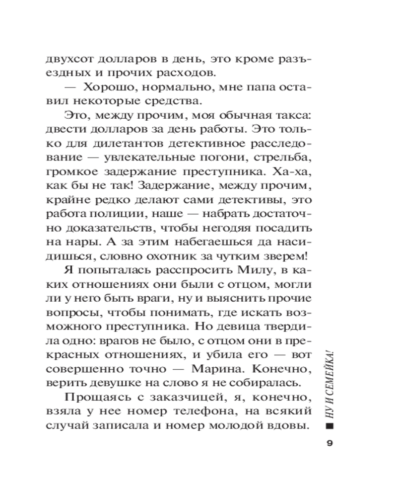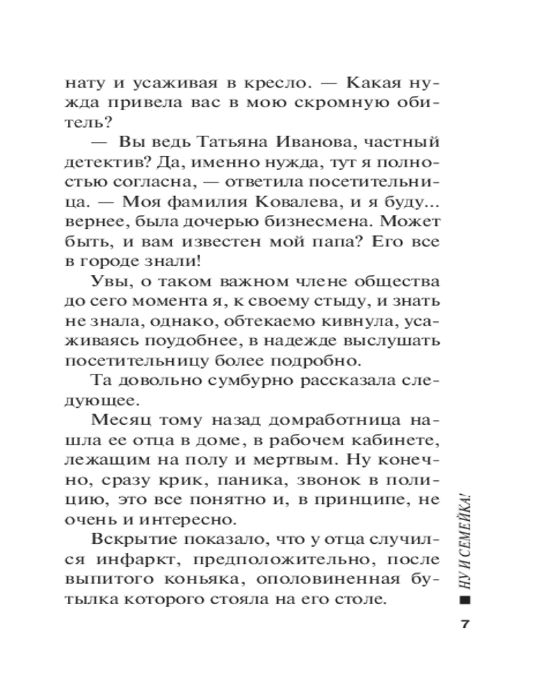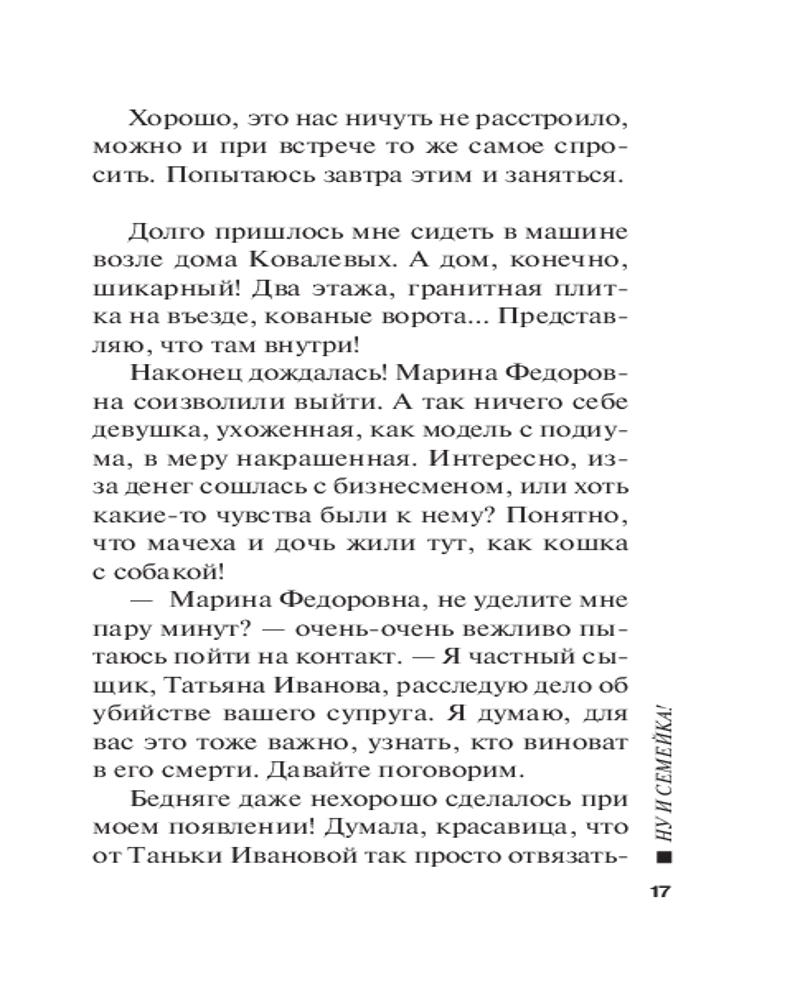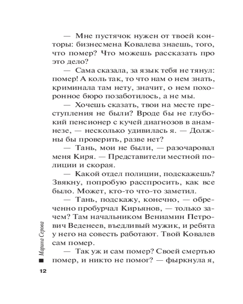 Серия: Русский бестселлер (обложка) К частному детективу Татьяне Ивановой обращается Мила, дочь погибшего бизнесмена Ковалева. Полиция закрыла дело как «смерть по естественным причинам», но девушка считает, что ее отца убили, и просит найти виновных. Улик нет, подозреваемых тоже — но сыщик Иванова намерена выяснить правду... |