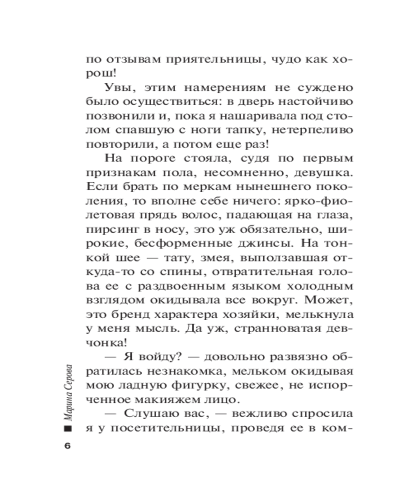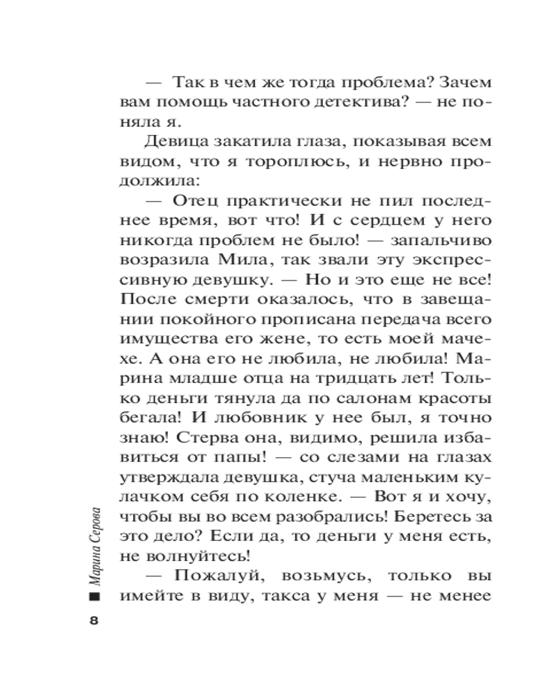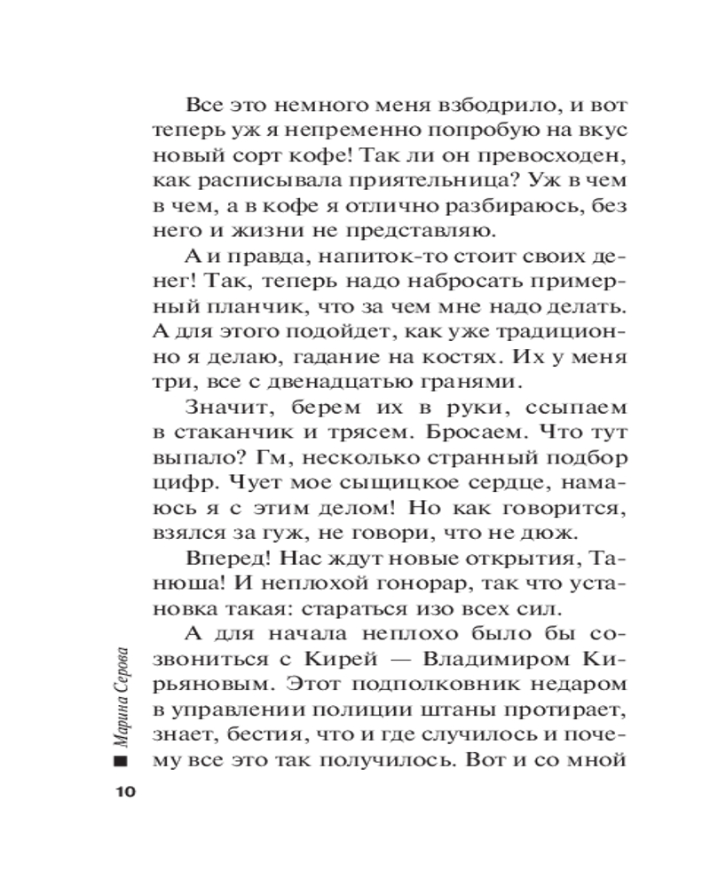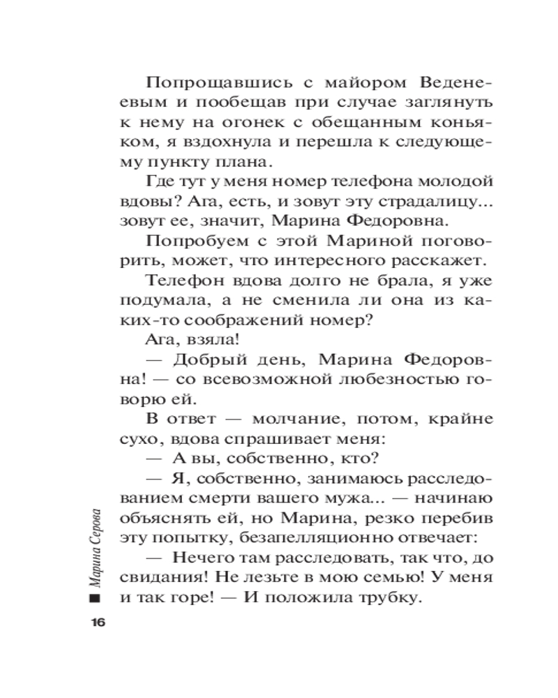 | Марина Сергеевна Серова — один из ведущих авторов серии современного русского детективного жанра (существует версия, что это коллектив авторов под общим руководством литературного агента Сергея Потапова). Согласно легенде, «выпускница юридического факультета МГУ, работала в Генеральной прокуратуре, сотрудница одной из спецслужб, участвовала в боевых операциях». Между тем написала 425 произведений размером порядка 200 страниц (и число их постоянно увеличивается). Часть произведений... |