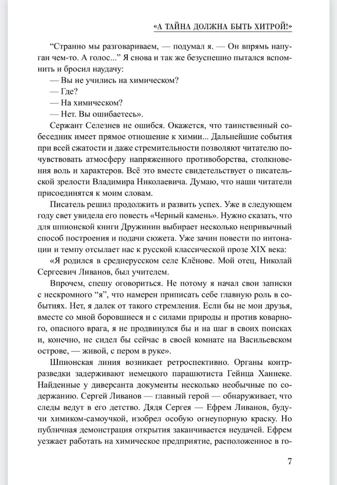 Серия: Шпионы. Дело №... Владимир Николаевич Дружинин (1908–1995) — видный русский писатель, автор множества исторических и географических книг. Особое место в его литературном наследии занимает шпионский жанр. Начиная со сборника рассказов «След Заур-бека» (1954) он показал себя мастером создания атмосферы психологического напряжения, умело сочетающейся с крепко выстроенным сюжетом. Повести «Черный камень» (1955) и «Тайна Россомахи» (1957) подтверждают писательскую репутацию. Шпионский сюжет органично дополняется интонациями классической русской литературы, создавая особое читательское послевкусие, не утратившее своего обаяния даже спустя семьдесят лет после своего написания. |