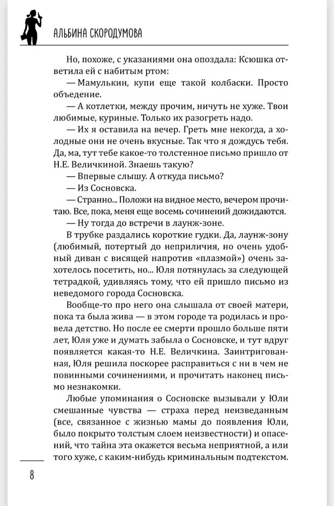 Серия: Леди-детектив Когда рутина накрывает с головой, в личной жизни длительный простой и полное отсутствие перспектив, да и одиночество уже наступает на пятки, Юлии Нечаевой приходит письмо от незнакомки из неизвестного города Сосновска. Некая дама сообщает о том, что она стала наследницей маленькой квартиры и большого семейного архива своей родной тетушки, о существовании которой даже не подозревала. Юля принимает решение поехать в этот город, и тут начинается самое интересное. В жизни больше нет места скуке и одиночеству, на смену им приходят приключения, которые начинаются уже у трапа самолета, перенесшего ее из размеренной жизни в водоворот невероятных событий и встреч. Девушке через многое придется пройти, чтобы понять, зачем судьба устраивает ей нелегкие испытания с непонятными целями... |