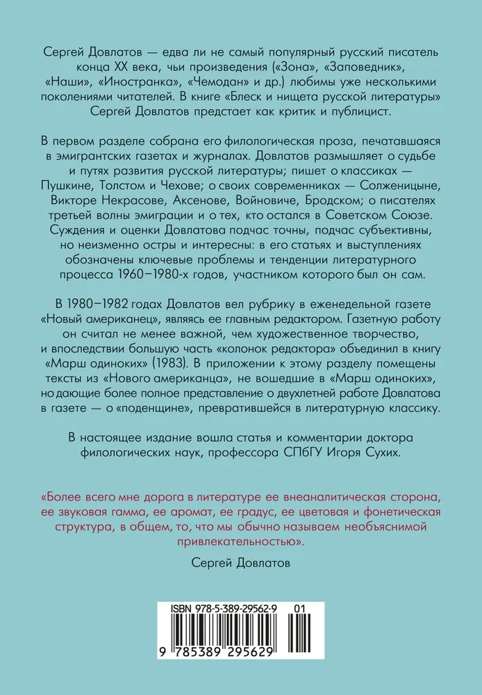 Серия: Бестселлеры Non-Fiction Сергей Довлатов — едва ли не самый популярный русский писатель конца ХХ века, чьи произведения («Зона», «Заповедник», «Наши», «Иностранка», «Чемодан» и др.) любимы уже несколькими поколениями читателей. В книге «Блеск и нищета русской литературы» Сергей Довлатов предстает как критик и публицист. В первом разделе собрана его филологическая проза, печатавшаяся в эмигрантских газетах и журналах. Довлатов размышляет о судьбе и путях развития русской литературы; пишет о классиках — Пушкине, Толстом и Чехове; о своих современниках — Солженицыне, Викторе Некрасове, Аксенове, Войновиче, Бродском; о писателях третьей волны эмиграции и о тех, кто остался в Советском Союзе. Суждения и оценки Довлатова подчас точны, подчас субъективны, но неизменно остры и интересны: в его статьях и выступлениях обозначены ключевые проблемы и тенденции литературного процесса 1960–1980-х годов, участником которого был он сам.  |