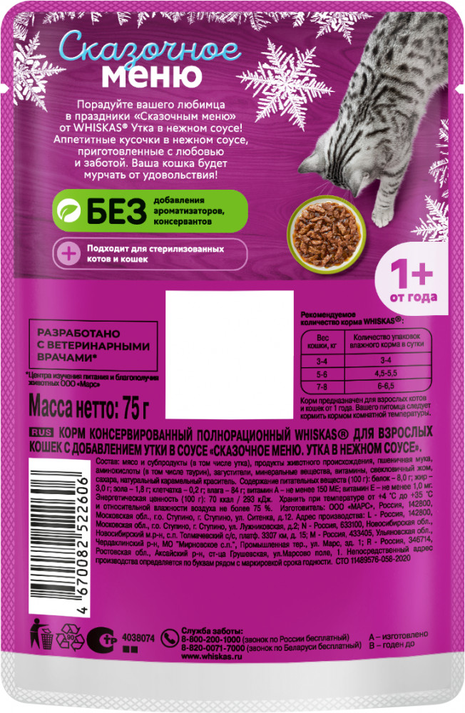 Whiskas Корм влажный для взрослых кошек с добавлением утки в соусе «Утка в нежном соусе»