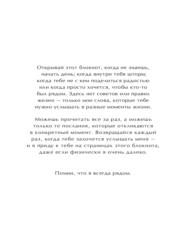 Серия: Подарки для самых любимых Когда человек, которого вы любите, далеко, даже обычный день может казаться слишком тяжёлым. Этот блокнот — как тихий голос рядом: он предлагает тёплые послания, которые можно читать, когда особенно сильно ощущается разлука. Созданный как подарок тем, кто скучает, блокнот подходит для любого, кто переживает разлуку, — с другом, партнёром, родителем или ребёнком. Внутри — страницы с сообщениями, наполненными любовью, поддержкой и напоминанием: вы не одиноки. Читайте его постранично — или весь сразу. Держите рядом и возвращайтесь к нему столько раз, сколько нужно. |