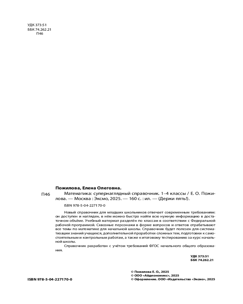 Серия: Держи пять! Справочник для учеников 1, 2, 3 и 4 класса — это универсальный помощник для изучения и закрепления всех правил по математике за курс начальной школы. Эта книга станет незаменимым инструментом для школьников, их родителей и педагогов. Благодаря наглядным схемам, таблицам, картам памяти и иллюстрациям справочник поможет легко усвоить программу и подготовиться к контрольным работам, самостоятельным заданиям и итоговым тестам. Правила математики объясняются в лёгкой и доступной форме, что позволяет ученикам начальной школы лучше усваивать информацию. На каждый конкретный вопрос даётся понятный и исчерпывающий ответ. Справочник хорошо структурирован, позволяет удобно и быстро ориентироваться по темам, поэтому станет универсальной шпаргалкой для подготовки к урокам. |